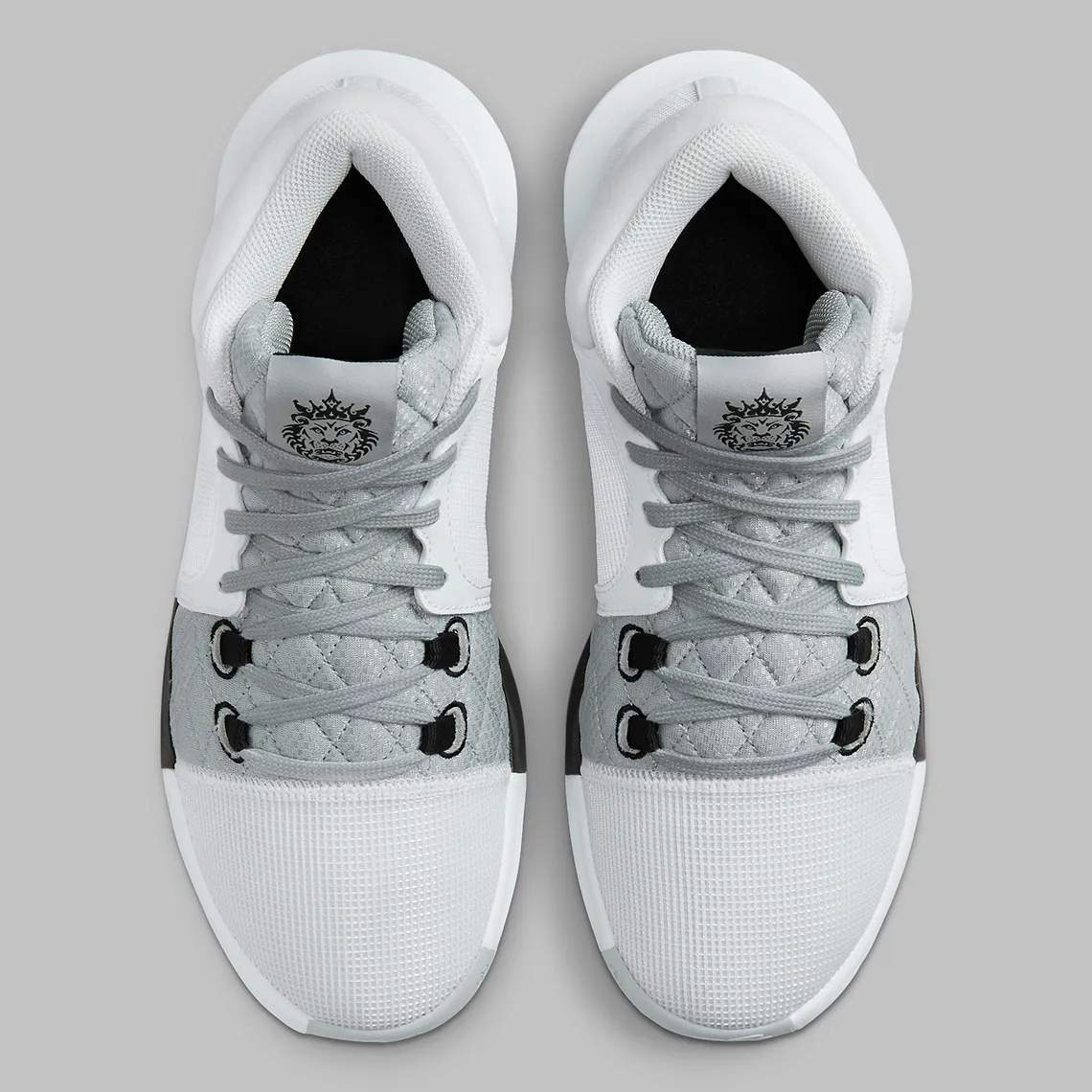 La tige principalement blanche est assortie d’un “Swoosh” en noir et gris ainsi que son logo représentant un lion, également en gris. On retrouve le même gris sur la languette et sur une bande présente à l’avant du pied. L’ensemble repose sur une semelle en blanc, gris et noir, faisant notamment ressortir les contours de la couronne du King.