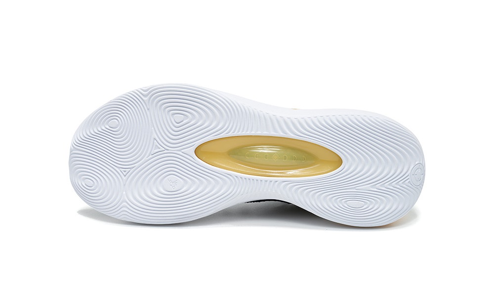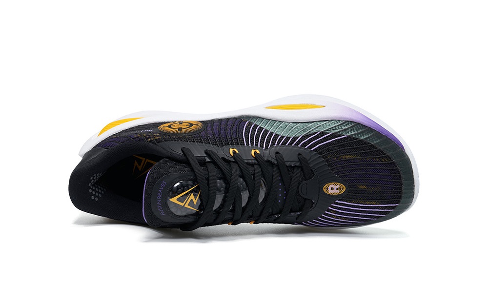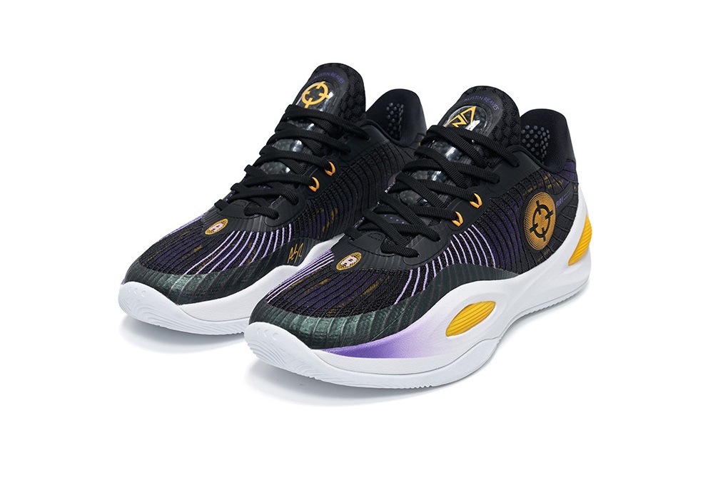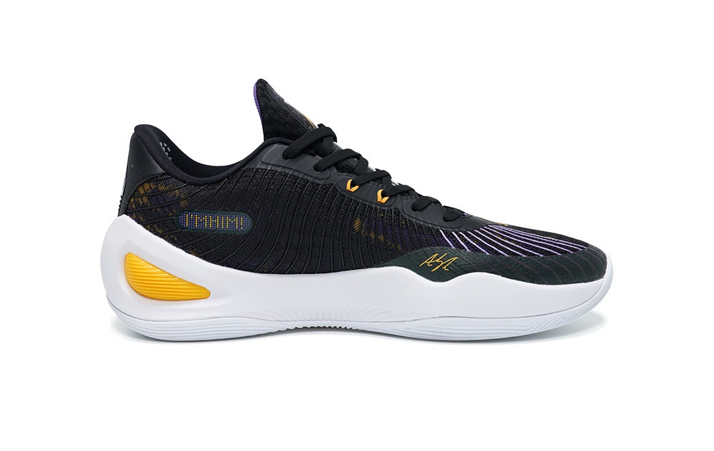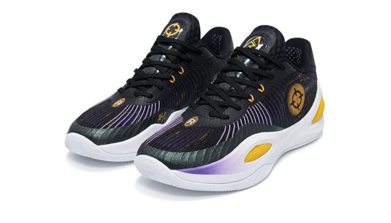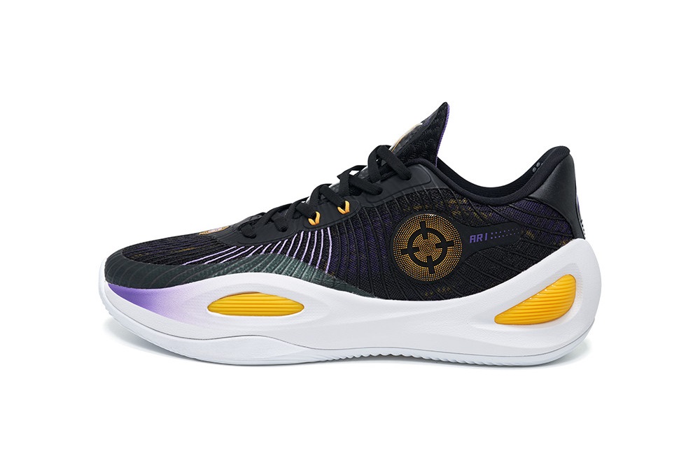 C’est le coloris « Showtime Lakers » qui a été choisi pour mettre en avant la AR 1. La tige noire est assortie de touches en « purple-and-gold » tandis que la semelle intermédiaire blanche comporte une touche de violet à l’avant et des renforts TPU en jaune. La signature du joueur apparaît en jaune sur la base de la tige.