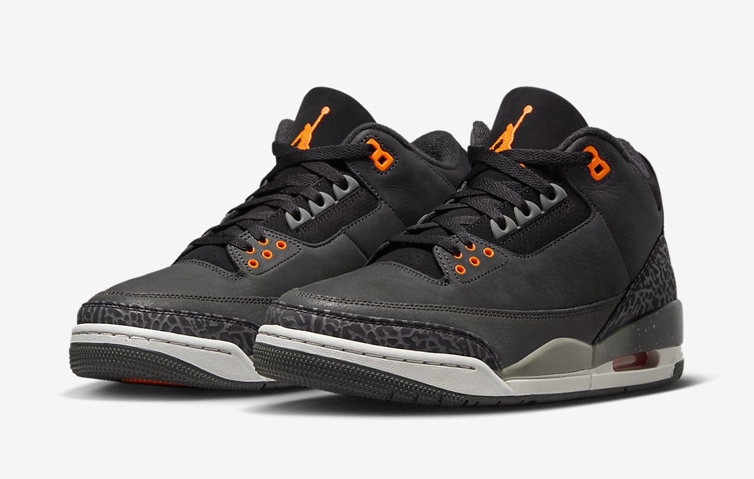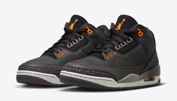 La Air Jordan 3 du même nom va lancer le bal avec sa tige noir et son revêtement en imprimé éléphant en noir et gris à la base du talon et de l’avant du pied. L’ensemble reposant sur une semelle en gris et noir est complété par des finitions en orange, pour faire ressortir les œillets ou encore les logos « Jumpman » sur la languette et au niveau du talon.