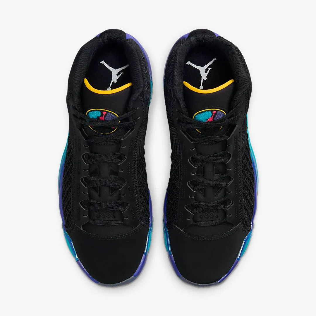 On retrouve ici une tige principalement noire, avec des contours en jaune au niveau du col. La semelle se démarque par ses notes de violet et bleu turquoise, l'ensemble reposant sur une semelle extérieure translucide. Le même ornement se trouve en violet et bleu turquoise au niveau de la languette pour accompagner le “Jumpman” ressortant en rouge, tout comme à l'arrière de la paire, sur fond violet.