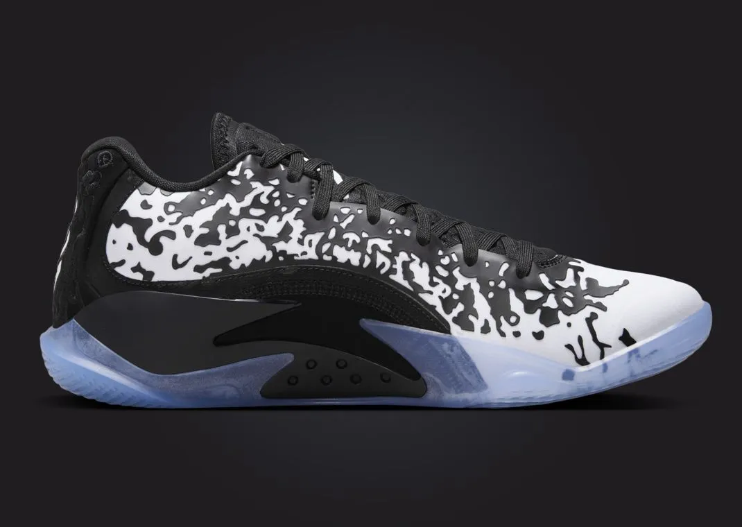 Le timing est parfait puisqu'une nouvelle Zion 3 investit le marché aujourd'hui, avec un coloris plus classique que les deux précédents. Intitulé “Black & White”, il se compose d'une tige avec une base blanche recouvert de “tâches” de noir. Les logos “Jumpman” et du joueur ressortent en blanc sur noir, ainsi qu'un petit “III” présent sur la languette.