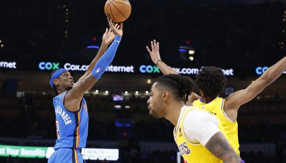Incertains mais finalement disponibles pour cette rencontre, disputée en « back-to-back », Anthony Davis (31 points, 14 rebonds) et LeBron James (21 points, 12 rebonds, 6 passes) ont fait leur match, sauf qu’ils n’ont pas pu éviter aux Lakers la défaite face au Thunder (133-110) d’un grand Shai Gilgeous-Alexander (33 points, 7 passes).