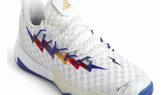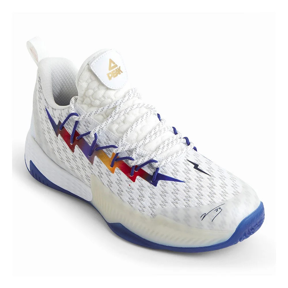 C’est le coloris « 6th Man » qui a été choisi, l’ancien arrière ayant été élu meilleur sixième homme de la ligue en 2015, 2018 et 2019. La tige en mesh blanc est assortie d’un long éclair habillée de dégradés allant du bleu nuit au jaune en passant par du rouge. Le logo Peak apparaît en doré sur la languette et en rouge sur le talon. La semelle extérieure ressort en bleu.