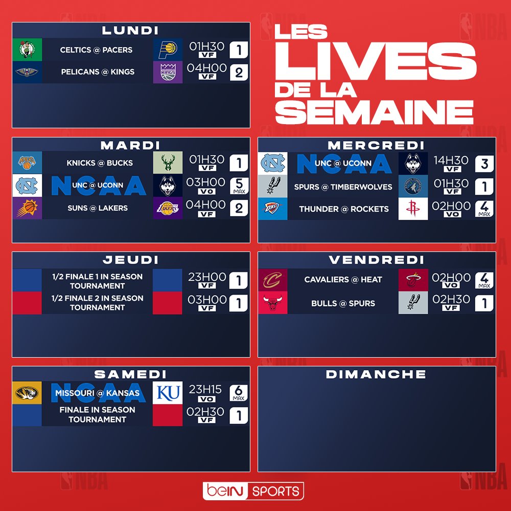 Outre le dénouement de ce tournoi, on suivra également le nouvel affrontement entre LeBron James et Kevin Durant, respectivement 1er et 10e meilleurs marqueurs de l’histoire de la NBA. A suivre le second duel de la saison entre Victor Wembanyama et Rudy Gobert, mercredi soir, synonyme de choc des extrêmes entre la meilleure et la pire équipe de l’Ouest. Le même jour, l’affrontement des « young cores » du Thunder et des Rockets vaudra aussi le détour.
