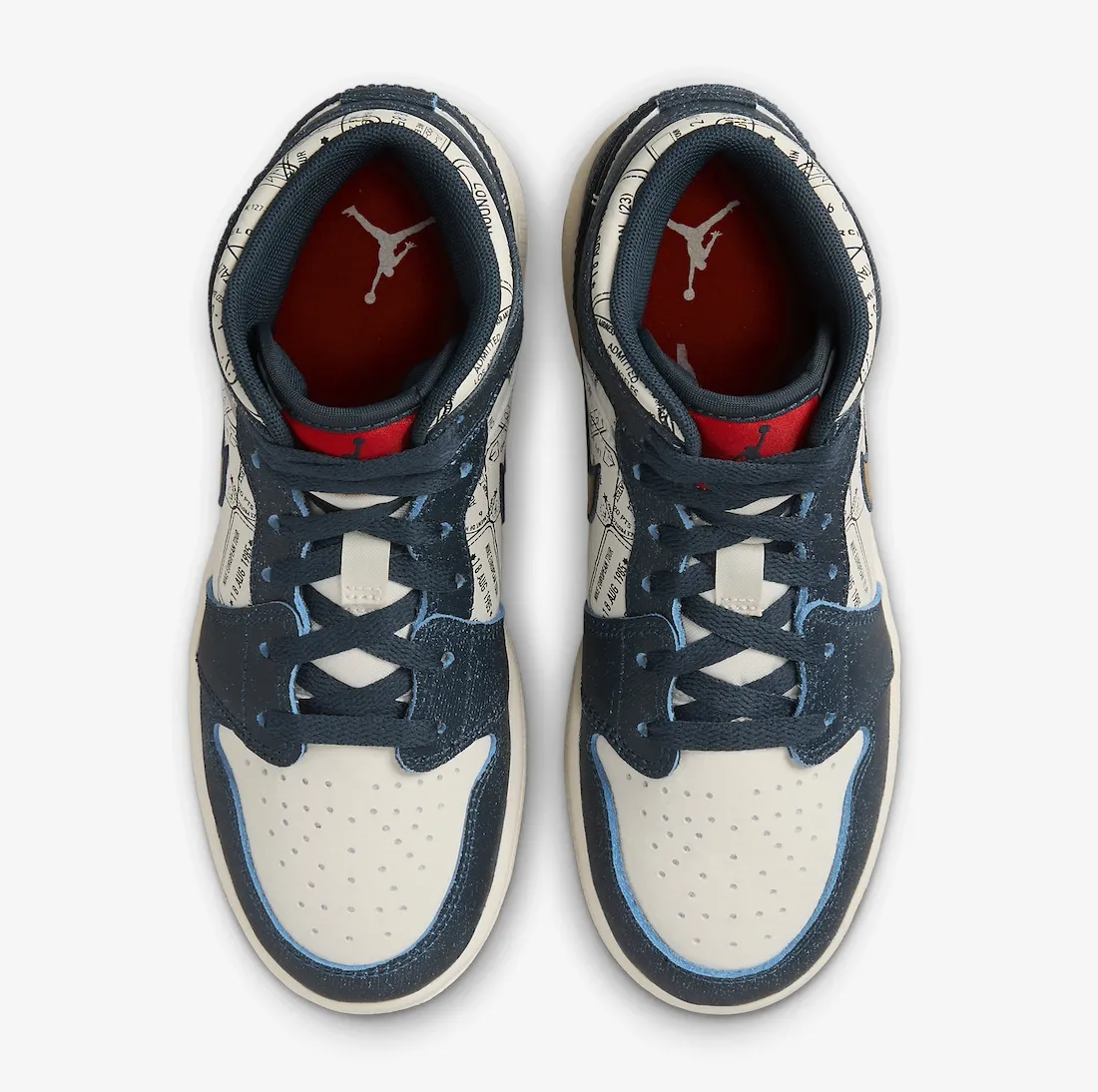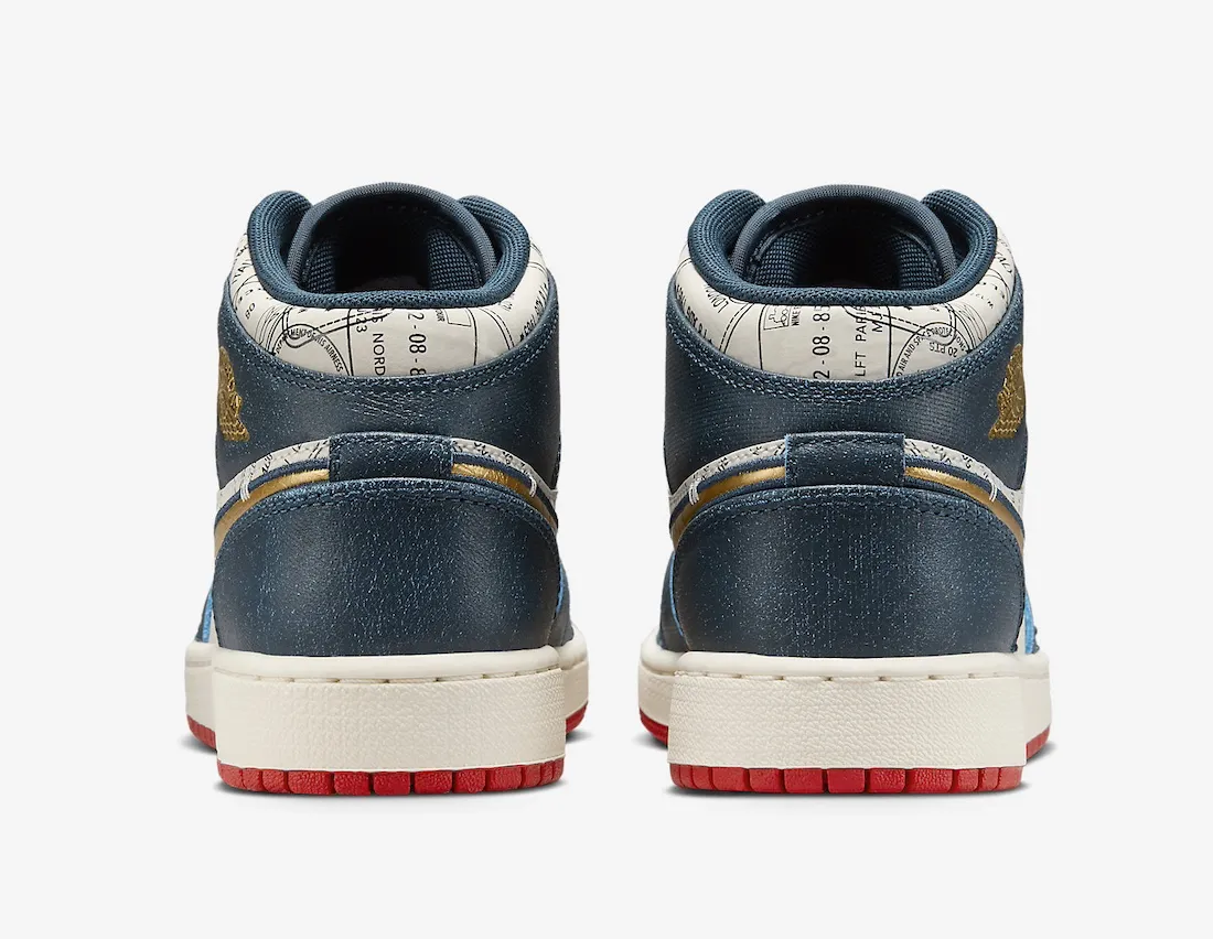 Il faudra attendre février pour tenter de s’offrir cette Air Jordan 1 Mid SE GS Take Flight. Les couleurs sont nombreuses avec du bleu marine, du doré, ou encore du noir et du rouge. Mais tout est en harmonie, sans que ce soit bariolé. Sur la base en cuir, on découvre des tampons de passeport et ils rendent hommage à des événements clés de la carrière de Michael Jordan. Plus précisément du début de sa carrière lorsqu’il écrivait les premiers chapitres de sa légende.