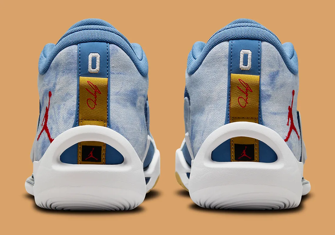 La majeure partie de l’empeigne est couverte par du bleu marine. Le denim se situe principalement au niveau du talon. Les finitions se présentent en rouge pour le « Jumpman » et le « JT », tandis que le numéro zéro du joueur apparaît en blanc. La signature du joueur se situe juste en dessous en rouge sur fond bronzé, une couleur qu’on retrouve également sur la semelle extérieure.