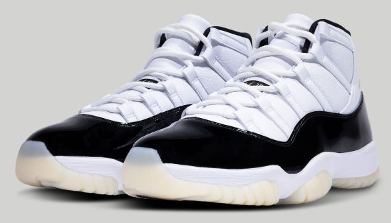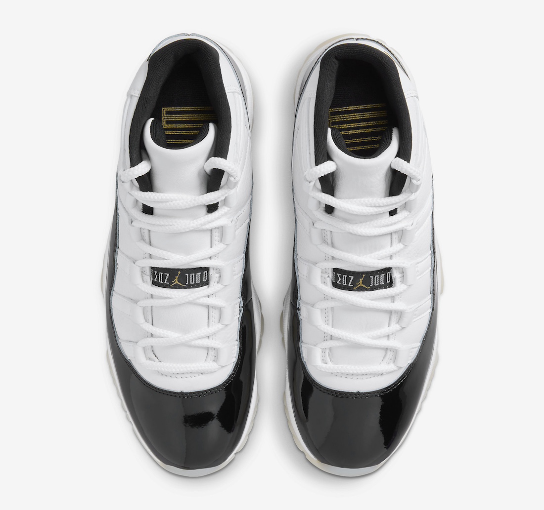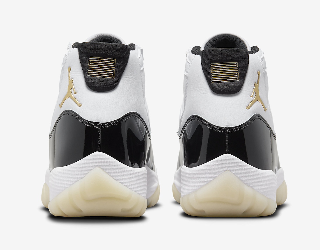 La version 2023 de cette AJ 11 Retro ‘Gratitude’ est basée sur le coloris original ‘Concord‘. Dotée d’une tige en cuir blanche et d’une bande de cuir verni noir autour de la chaussure, elle présente des touches d’or métallisé sur le logo Jumpman en relief au niveau du talon et sur la mention ” 23 ” à l’arrière.
