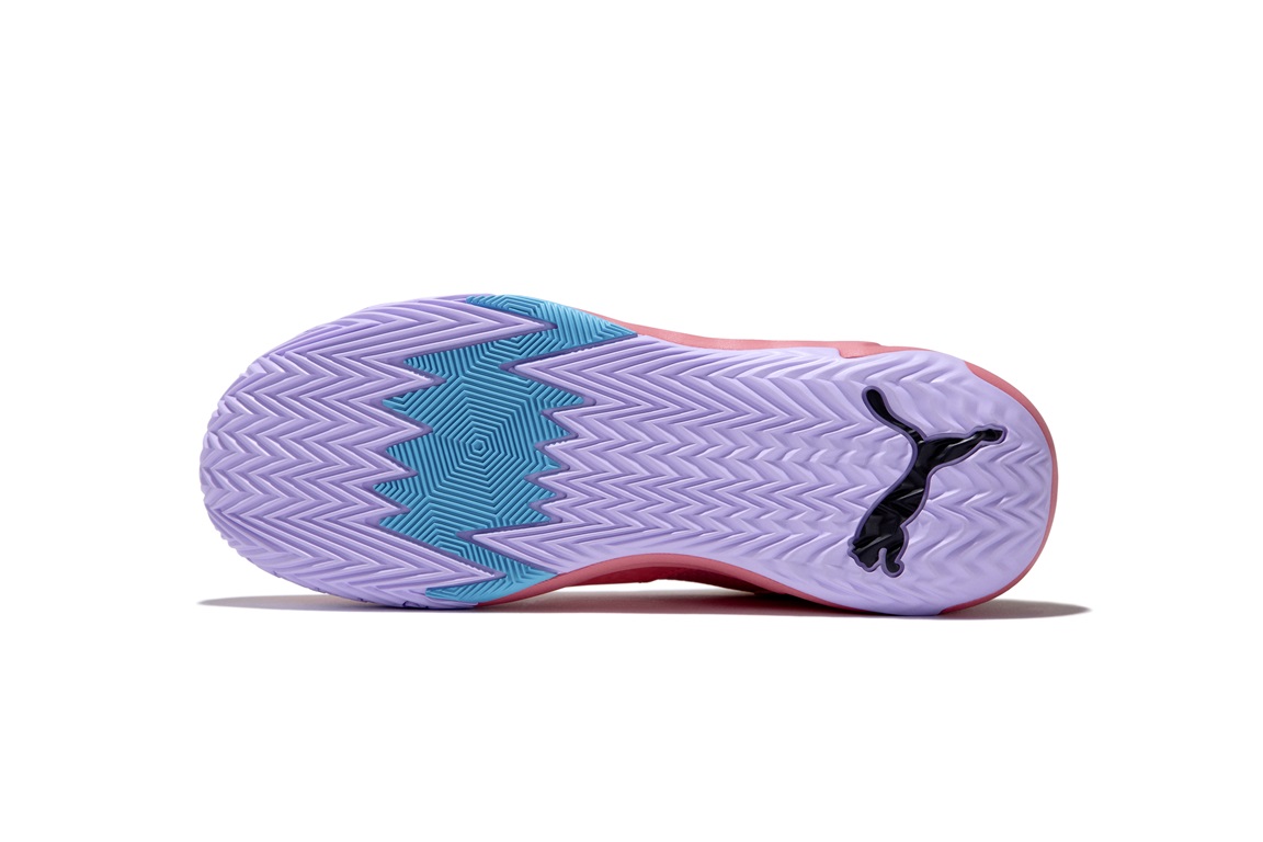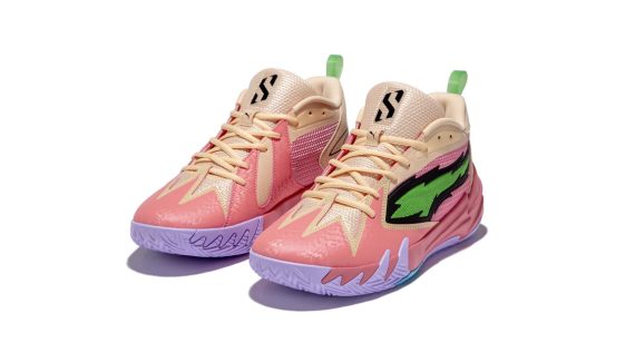 On note également une bande « Formstrip » renforcée pour le maintien, ici en vert sur l’empeigne, ainsi qu’une enveloppe en caoutchouc en forme de mâchoires agressives pour refléter « le jeu intrépide » de Scoot Henderson sur le terrain. Enfin, la tige couleur pêche est accompagnée d’une semelle extérieure en violet.