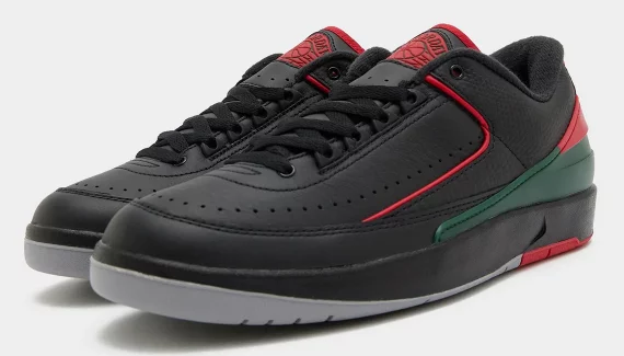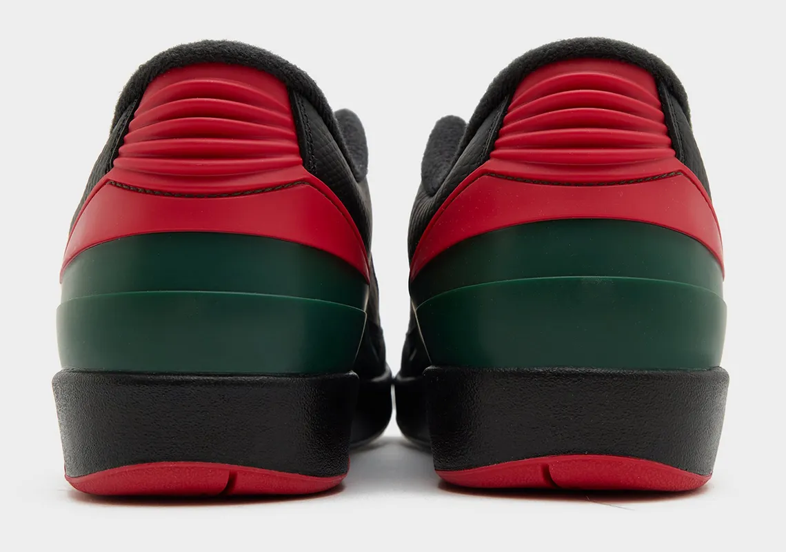 Pourquoi ce clin d’œil ? Car à l’origine, la AJ 2 se voulait un modèle haut de gamme et sa fabrication s’était alors installée de l’autre côté des Alpes. La tige en cuir noir est ainsi complétée de bandes vertes sur sa base arrière, tandis que des finitions en rouge bonifient l’ensemble, sur le logo « Air Jordan » présent sur la languette notamment.
