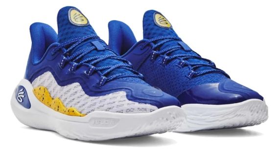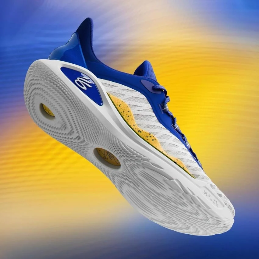 Baptisé « Dub Nation », le coloris reprend simplement les couleurs des Warriors. Principalement bleu marine, la tige est complétée d’une base blanche assortie d’un renfort latéral en jaune. La semelle UA Flow blanche est assortie d’un logo du joueur sur fond bleu, tandis que sa signature apparaît sous la semelle, en bleu sur fond jaune.
