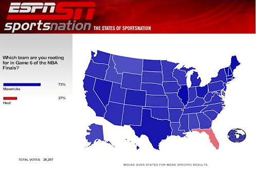 Aux Etats-Unis, un sondage de ESPN donne le ton sur l’état d’esprit qui règne là-bas. C’est un peu la Floride contre le reste du pays. C’est dire si la pression est énorme sur le duo Wade-LeBron. Ils doivent battre Dallas, mais aussi reconquérir l’opinion.