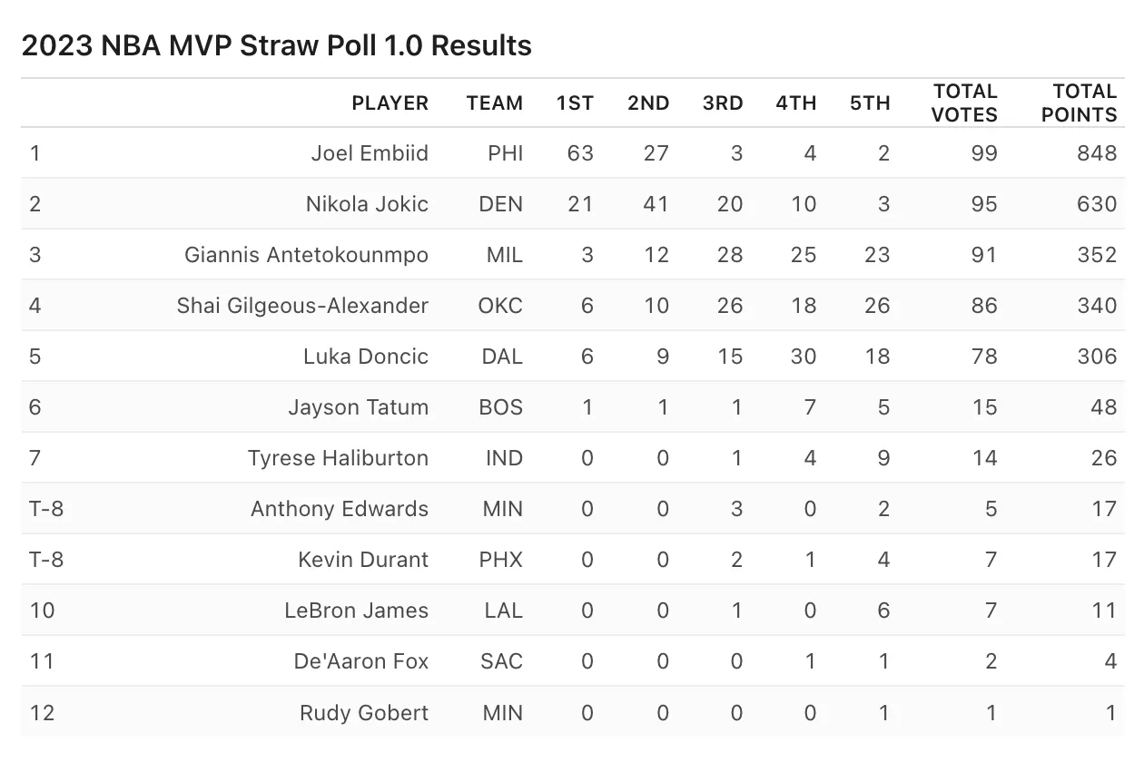 Après deux mois de compétition, c’est ainsi Joel Embiid qui arrive en tête de ce premier pointage, et d’assez loin, avec pas moins de 63 premières places (sur 100) pour un total de 848 points. Il faut dire que le pivot de Philadelphie, MVP en titre rappelons-le, semble être encore monté d’un cran individuellement (35.1 points, 11.8 rebonds, 5.9 passes, 1.9 contre, 1.1 interception) et collectivement (19-8, 3e à l’Est).