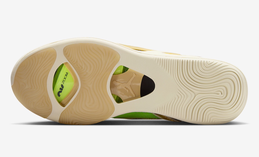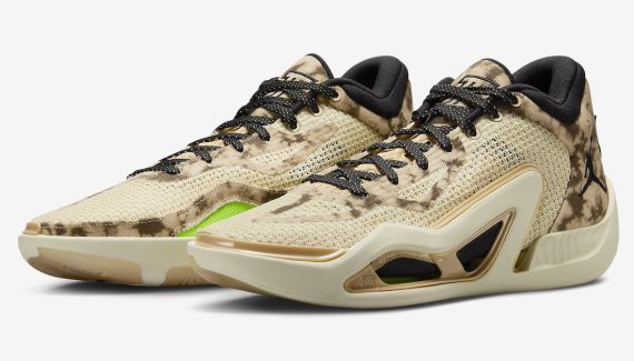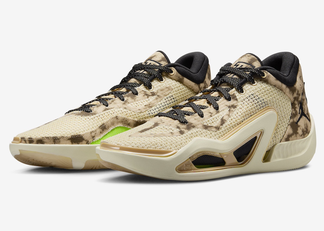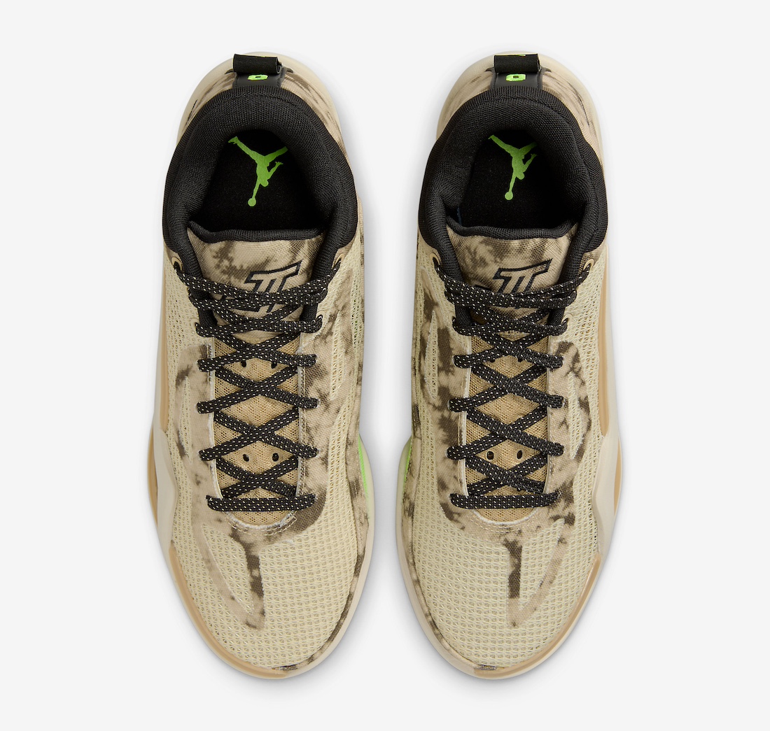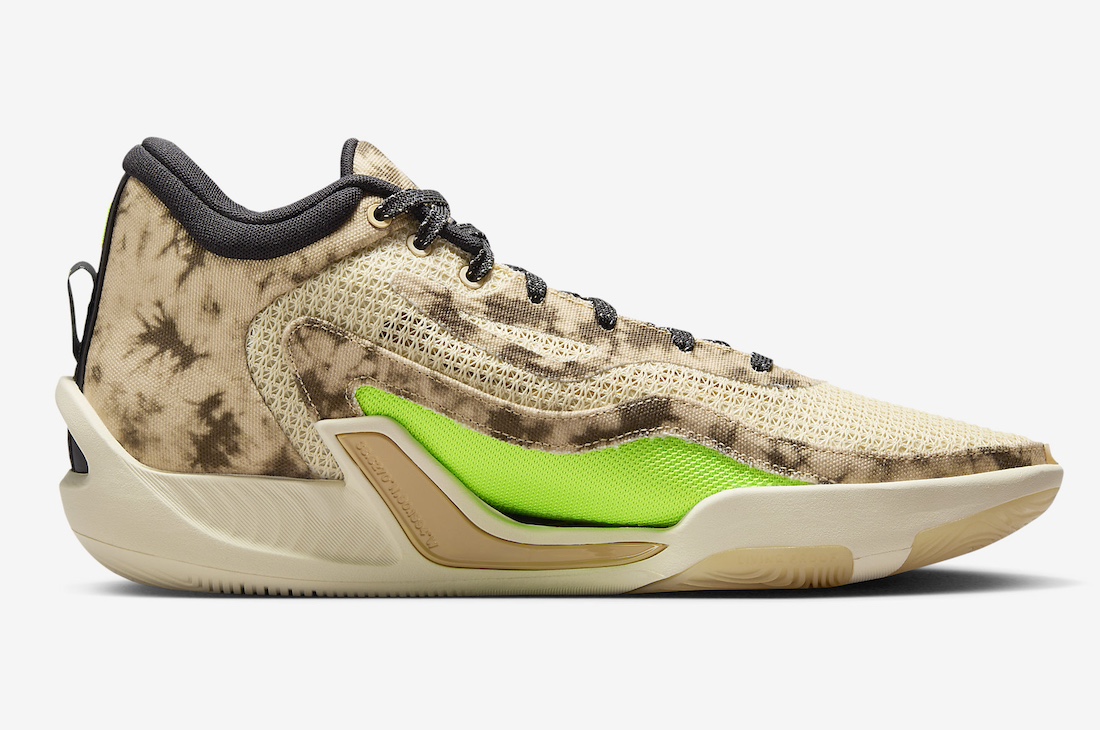 La tige en beige et blanc nacré est assortie à l’arrière de motifs « camouflage tie-dye » sur la partie en toile, tandis que le col et le logo « Jumpman » latéral apparaissent en noir. On note également des finitions en vert fluo « Volt » pour compléter l’ensemble.