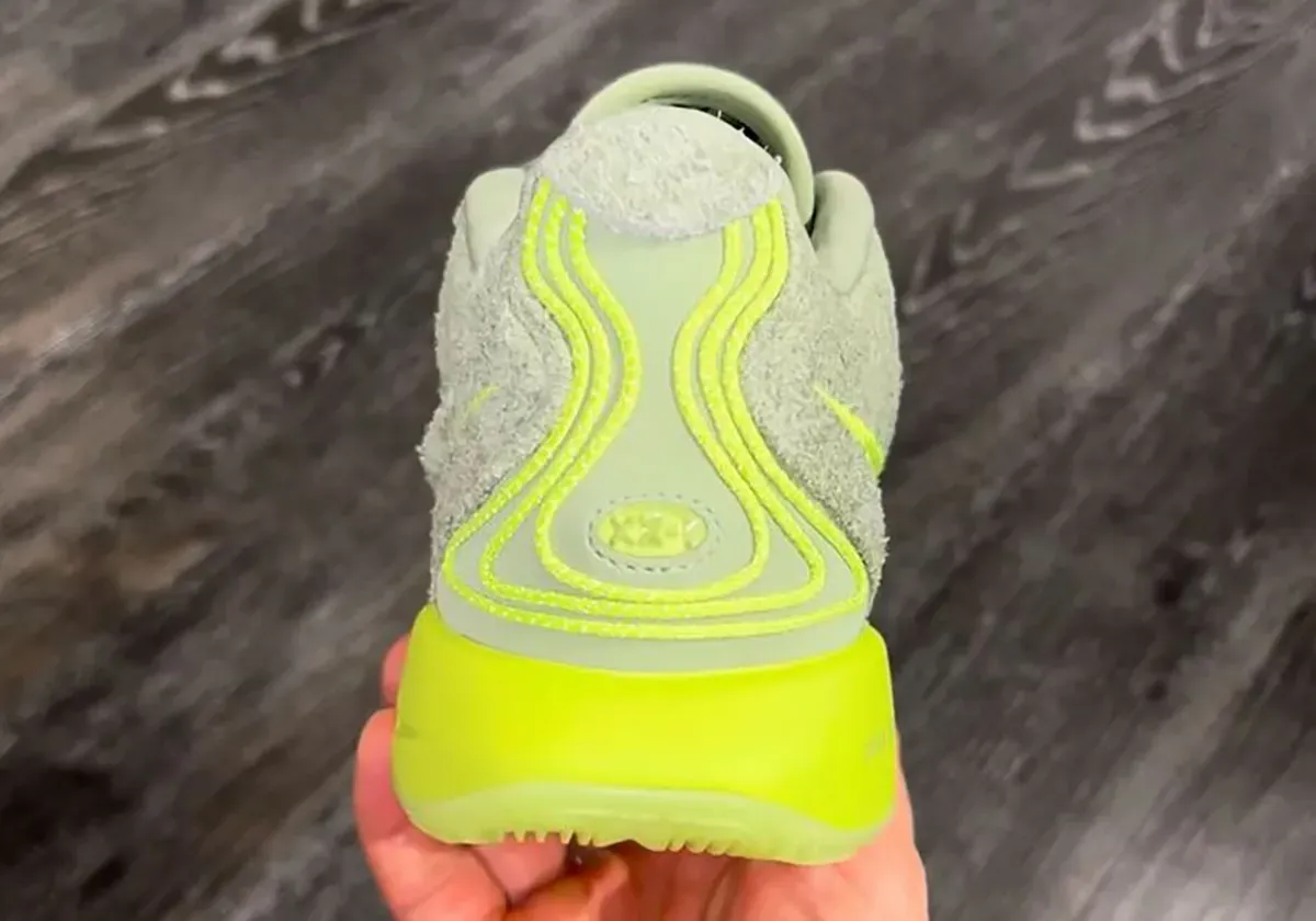 C'est aussi l'occasion d'instaurer un nouveau matériau pour sa tige, en daim couleur « Oil Green », soit un vert pâle proche du gris. L'ensemble est contrasté par des touches de vert fluo, sur les contours du Swoosh, la signature de LeBron James sur la languette, et principalement au niveau de la semelle.
