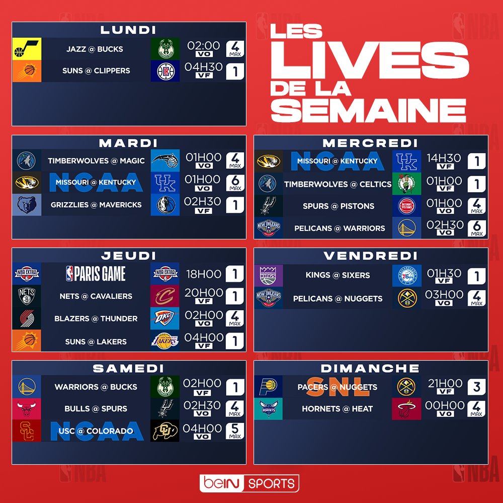 À noter, aussi, les retrouvailles entre Stephen Curry et Giannis Antetokounmpo samedi, ou l’alléchant Denver/Indiana de dimanche soir (21 heures). Côté NCAA, on peut souligner la diffusion du match entre Colorado et USC, avec la présence d’un certain Bronny James sur les parquets…