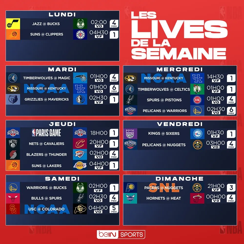À noter, aussi, les retrouvailles entre Stephen Curry et Giannis Antetokounmpo samedi, ou l'alléchant Denver/Indiana de dimanche soir (21 heures). Côté NCAA, on peut souligner la diffusion du match entre Colorado et USC, avec la présence d'un certain Bronny James sur les parquets…