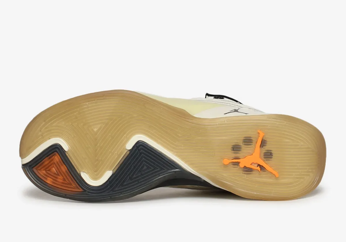 La tige se présente dans un blanc nacré style lait de coco et se trouve complété par du noir, sur le col, le talon et la languette. A noter également des finitions en orange, sur les logos du joueur et un « Jumpman » notamment. L’ensemble repose sur une semelle extérieure beige, noire et orange.