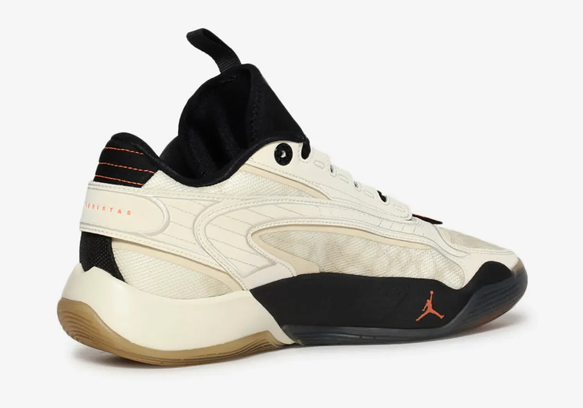 La tige se présente dans un blanc nacré style lait de coco et se trouve complété par du noir, sur le col, le talon et la languette. A noter également des finitions en orange, sur les logos du joueur et un « Jumpman » notamment. L’ensemble repose sur une semelle extérieure beige, noire et orange.
