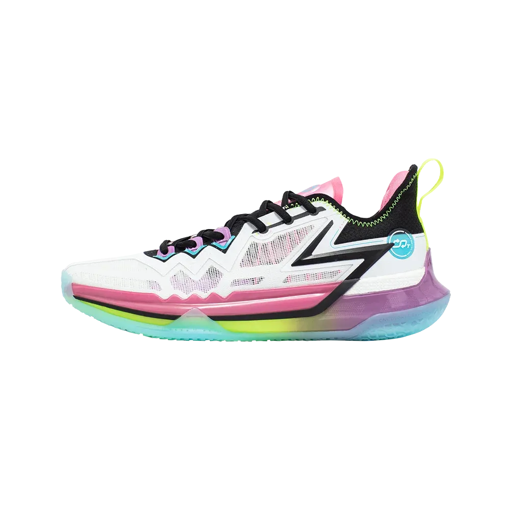 La semelle intermédiaire arbore un dégradé allant du violet au vert en passant par du jaune. L'ensemble repose sur une semelle extérieure en bleu ciel translucide.