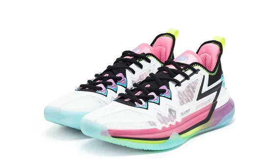 La paire est bien fournie en couleurs avec, pour compléter une tige en noir et blanc, des touches de rose, sur les bases latérales en TPU, une pastille en bleu ciel, une tirette jaune fluo et une languette également rose, assortie de quelques œillets en violet.
