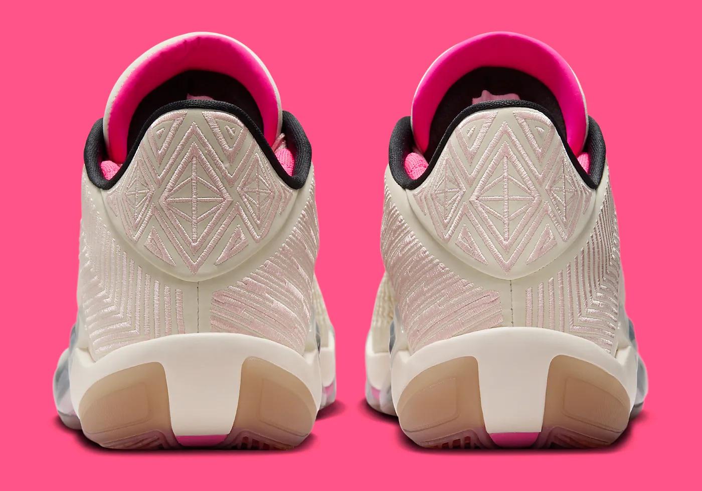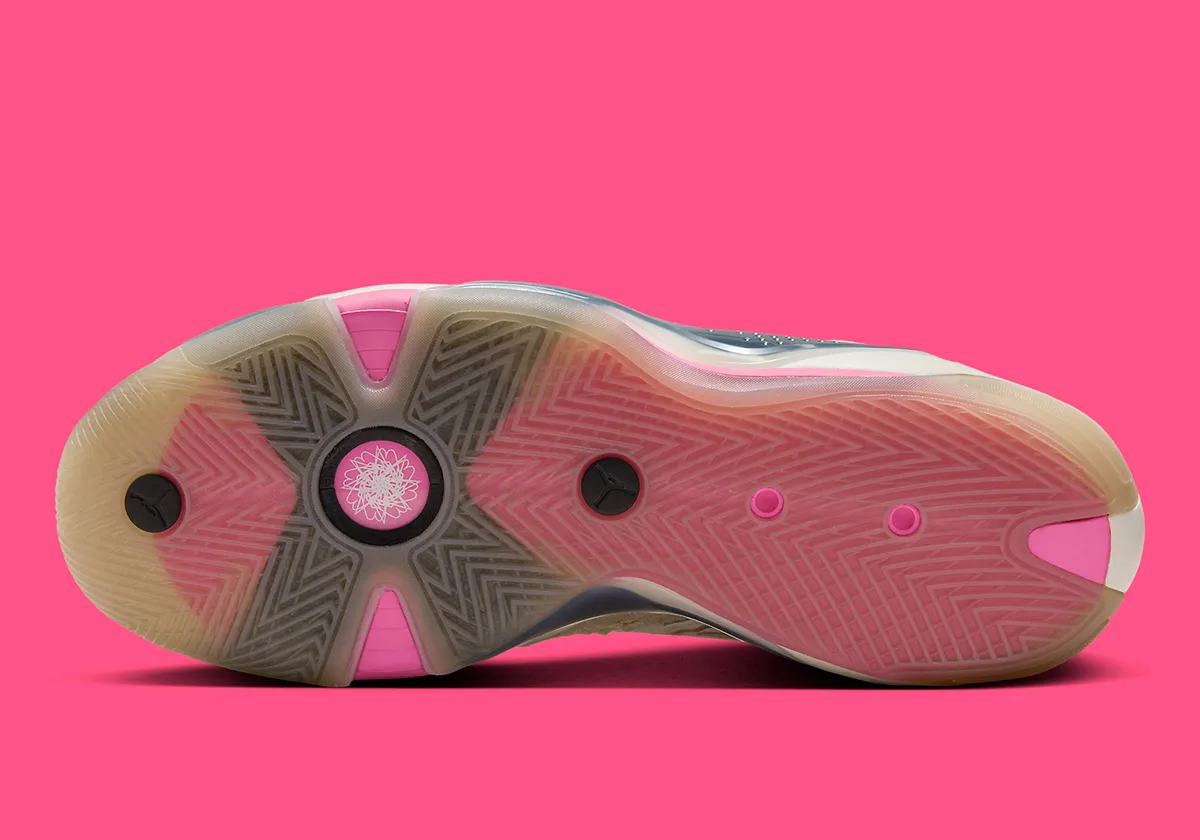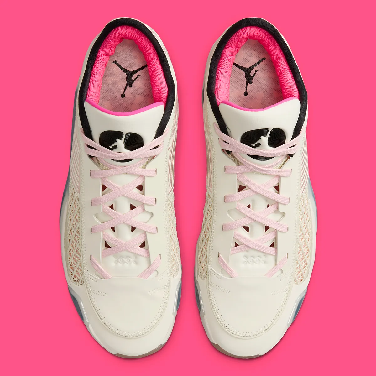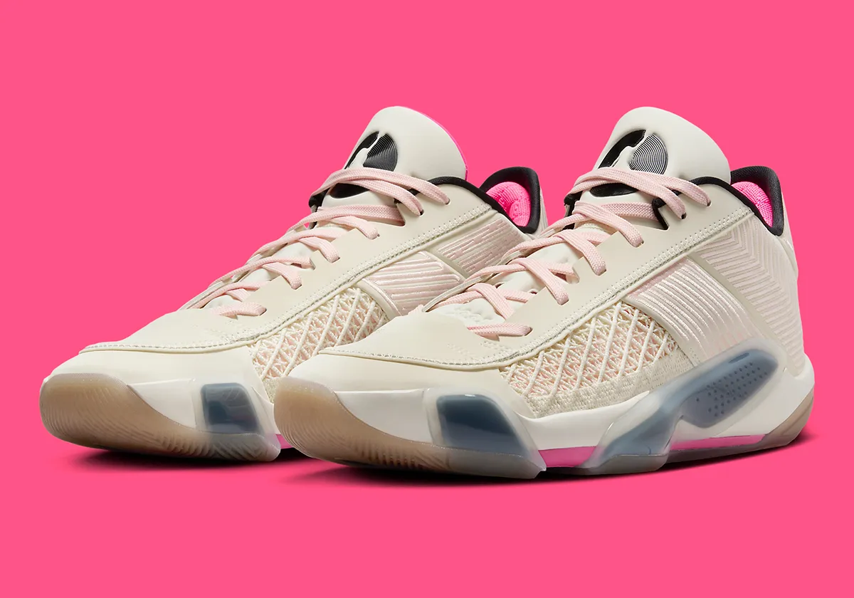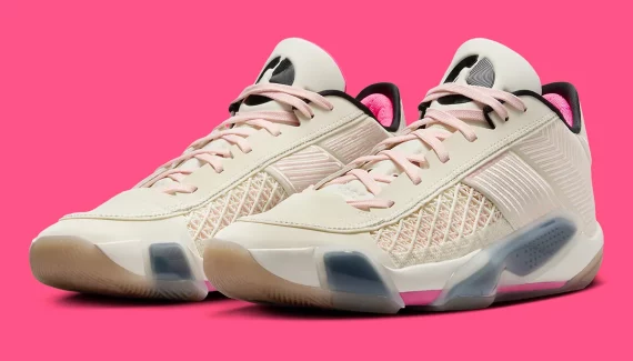 On retrouve une tige couleur blanc nacré-beige pour l’effet lait de coco, avec des touches de rose, pâle ainsi que sur les lacets, et plus foncé au niveau du col, pour compléter le tout. On trouve également des finitions en noir, pour faire ressortir le « Jumpman » sur la languette notamment. L’ensemble repose sur une semelle extérieure en beige translucide.