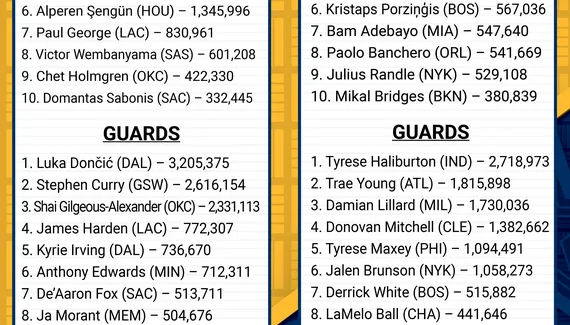 À l'Est, rien ne bouge non plus, avec Giannis Antetokounmpo (Bucks) en intouchable capitaine et qui devance toujours Joel Embiid (Sixers), Jayson Tatum (Celtics), Tyrese Haliburton (Pacers) et Trae Young (Hawks). À surveiller, cependant, la lutte entre Damian Lillard (Bucks) et Trae Young, car l'ancien Blazer compte environ 85 000 voix de moins que Young.