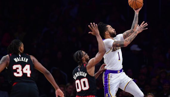 Le quatrième tir primé de D’Angelo Russell met les Lakers à +22 en troisième quart temps (99-77), avant que le sursaut de Jerami Grant (17 points) et d’Anfernee Simons (19 points) ne donne un brin d’espoir aux hommes de Chauncey Billups (103-87).