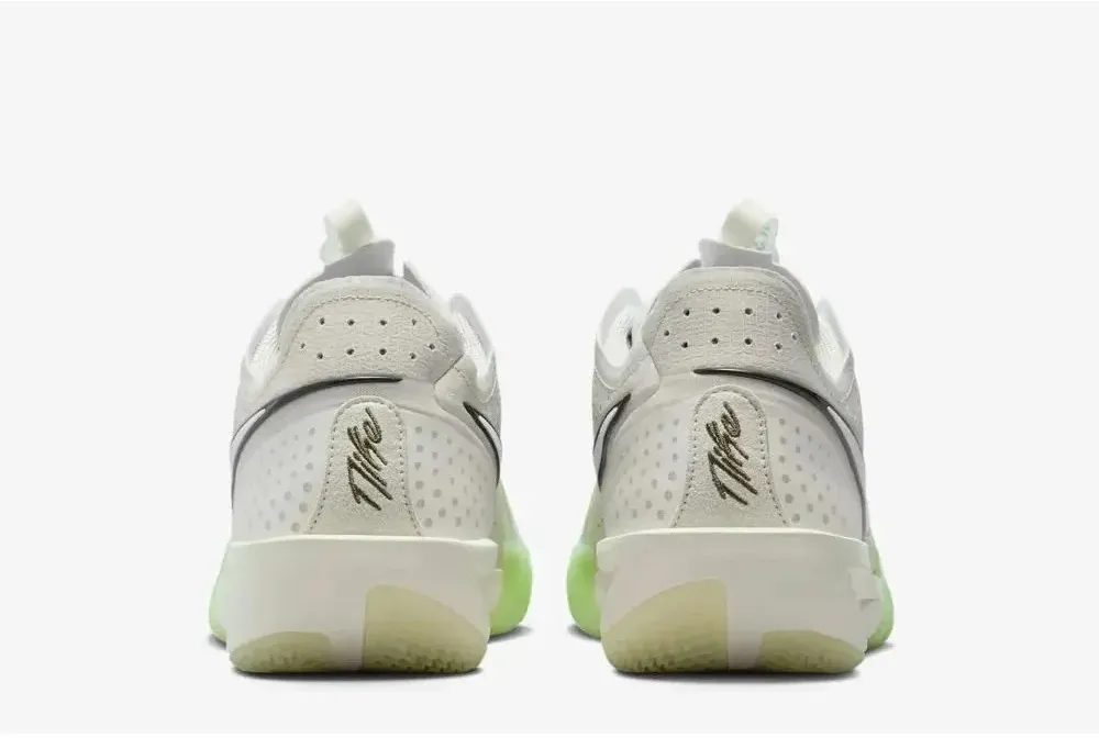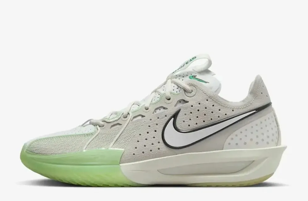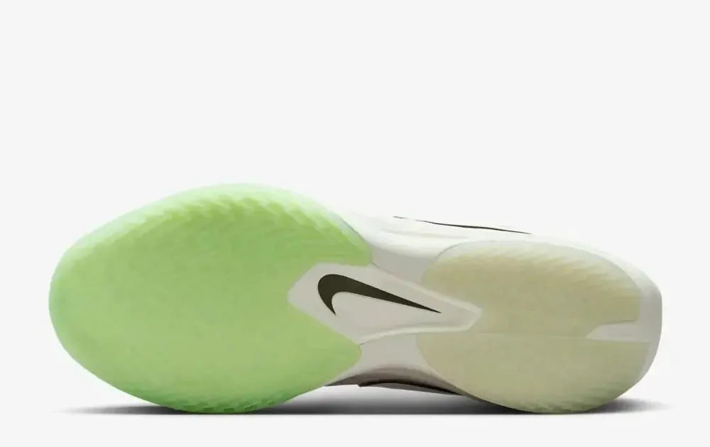 La tige est articulée entre un blanc « sableux » et du gris, avec un « Swoosh » ressortant en blanc avec des contours noirs. On retrouve également des finitions en vert pâle sur les parties latérales, sur la languette et sous la semelle.