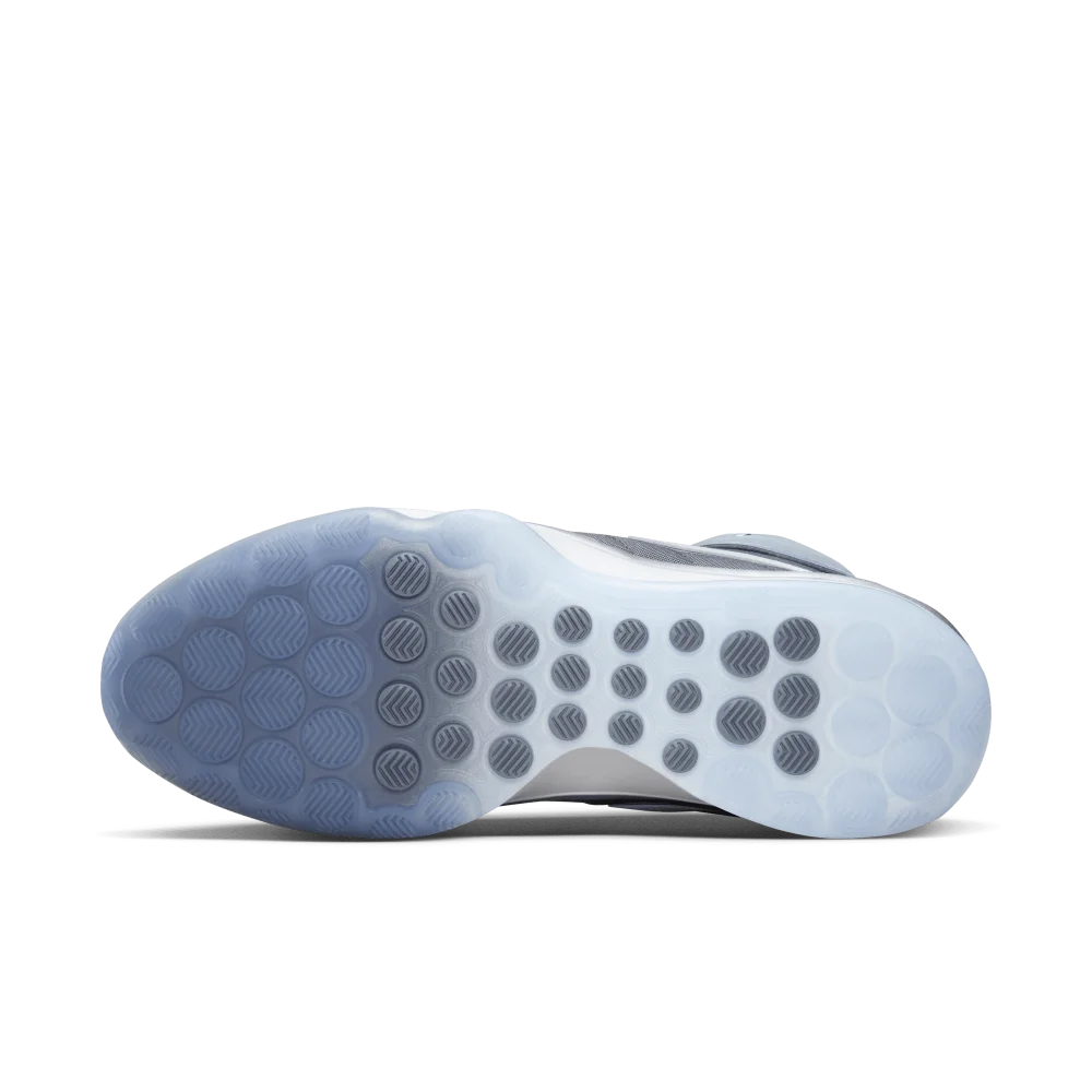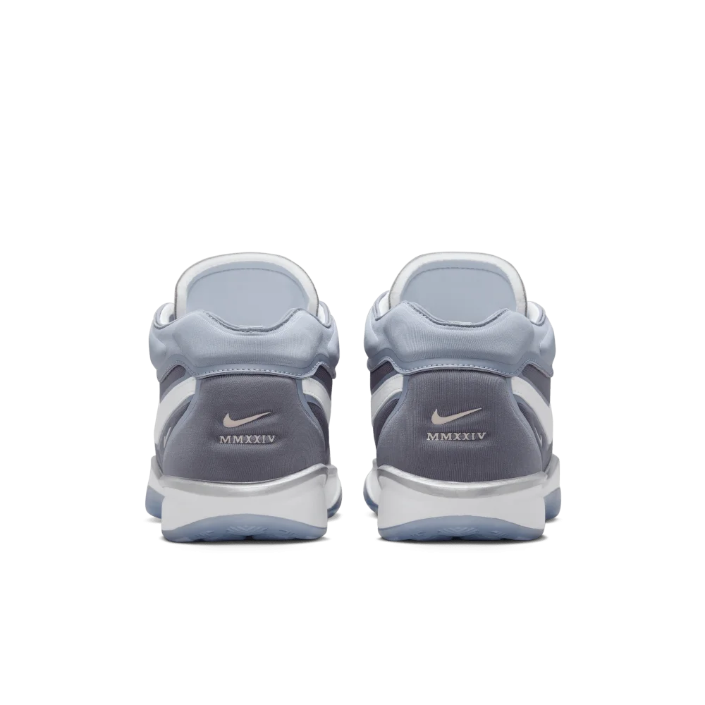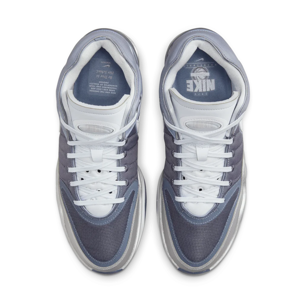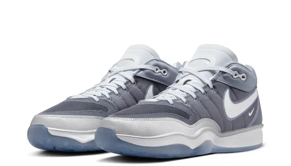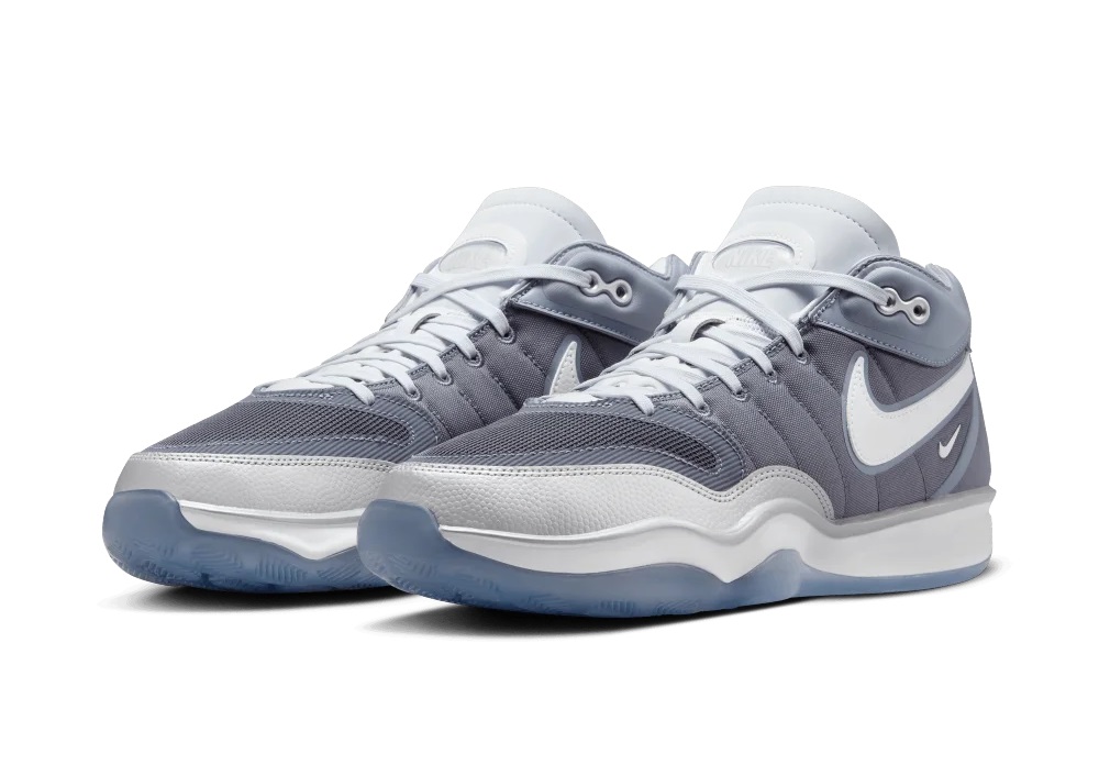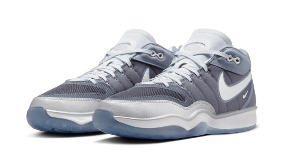 Celui-ci se présente avec une tige habillée en deux tons de gris, principalement foncé et doté de finitions en gris clair. Le « Swoosh », la languette et la base avant en cuir ressortent en blanc, tout comme la semelle intermédiaire, reposant sur une semelle extérieure en bleu clair translucide.