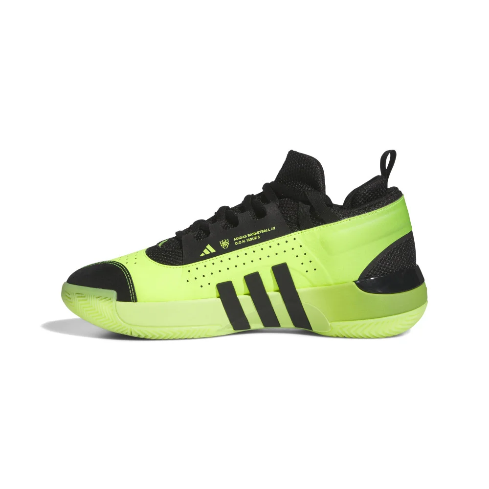Cette version de la cinquième chaussure signature de Donovan Mitchell ne passera pas inaperçue avec sa tige en vert fluo complétée de touches de noir, à l’avant et à l’arrière de la paire, sur la languette, et pour faire ressortir les trois bandes latérales.