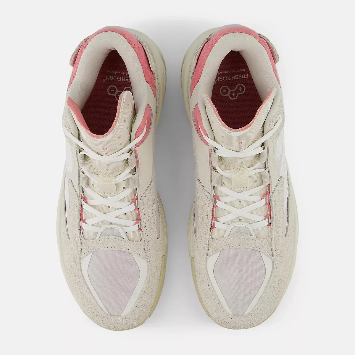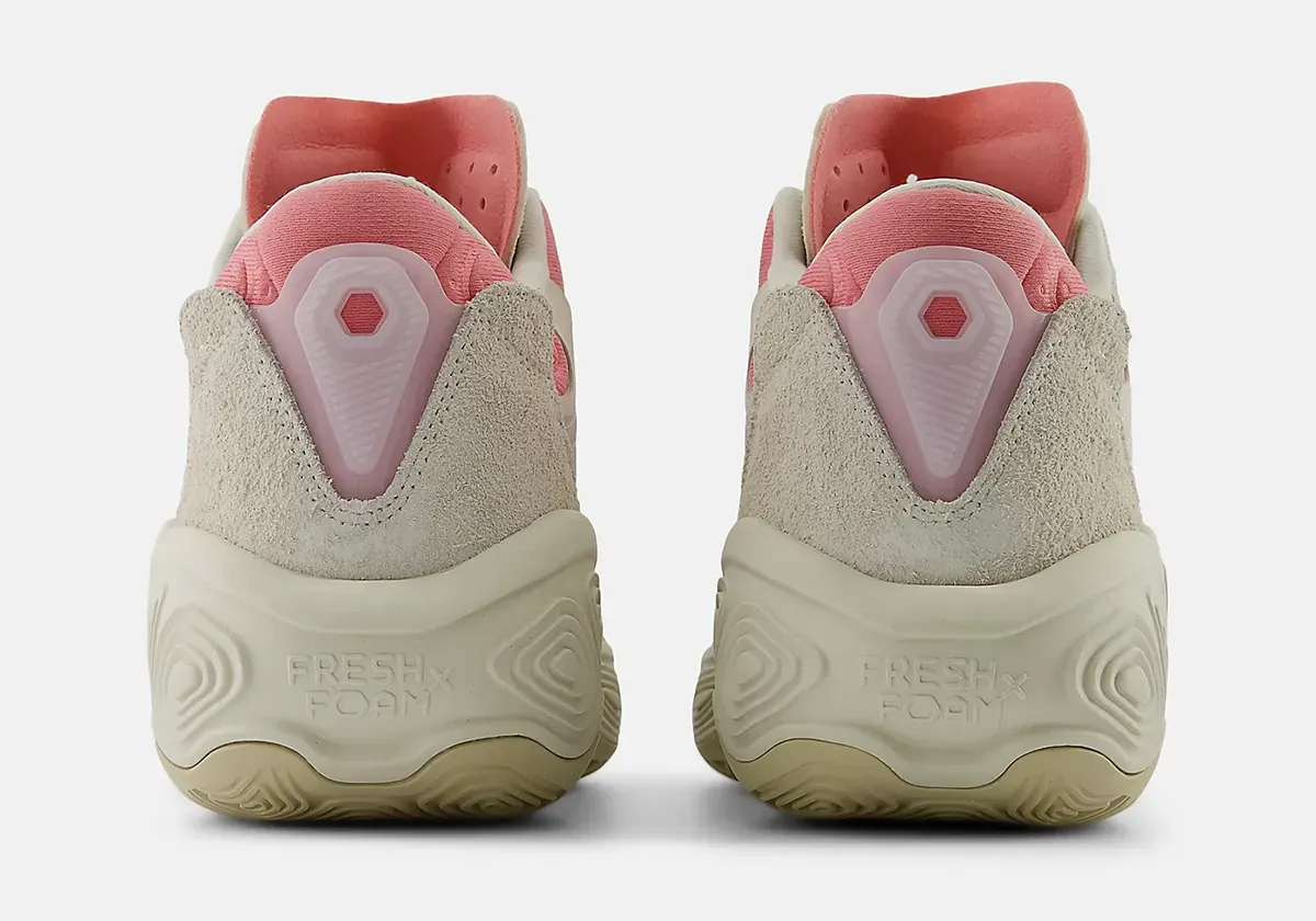 Cette deuxième version a notamment revu la composition de sa tige, celle-ci étant un peu plus haut de gamme avec une large partie en daim pour entourer l'empeigne sur laquelle ressort le “N” de New Balance. L'aération est bien présente au niveau de la semelle et on attendra également beaucoup de la semelle avec sa mousse “Fresh Foam” et son amorti au niveau intermédiaire. Pour ce premier coloris, on part sur une majeure partie en blanc et beige avec des finitions en rose.