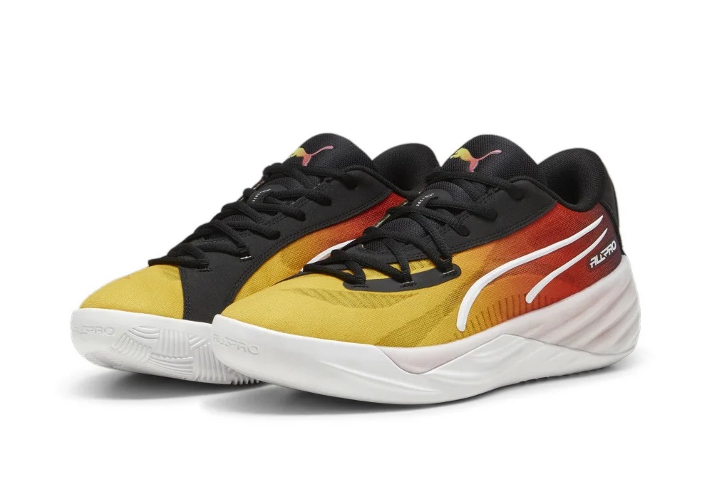 La tige offre ici un dégradé allant du rouge au jaune en passant par de l’orange, complétée par des bandes noires sur la partie supérieure pour accompagner la languette également noire. La tige est traversée par deux bandes “PWR Tape” blanches ainsi que l’inscription “All-Pro”. La semelle assortie de sa mousse Nitro apparaît également en blanc.