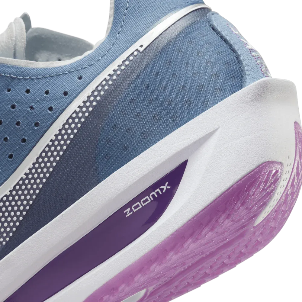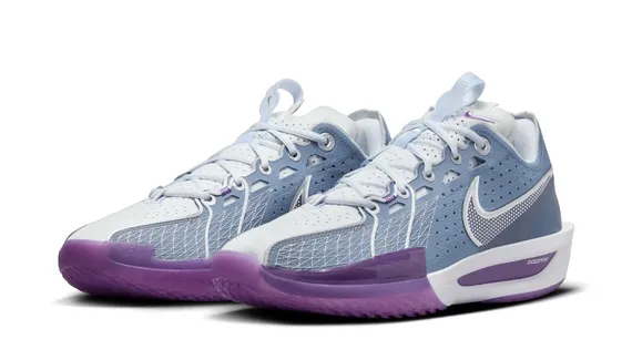 Sur ce troisième coloris baptisé « Ashen Slate », la tige alterne entre gris et blanc, avec des pointillés ressortant à l'intérieur du « Swoosh » sur l'empeigne, et des finitions en violet. La semelle en blanc et violet complète l'ensemble.