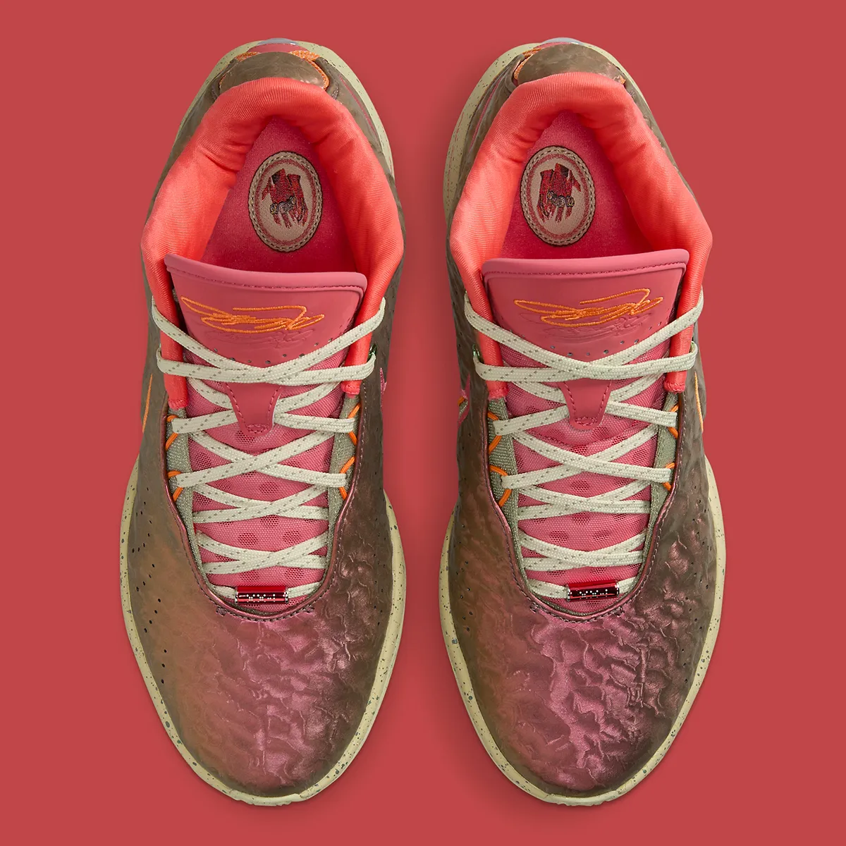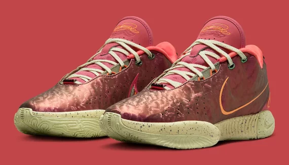 La tige d’un ton rougeâtre appelé « Ember Glow » est assortie d’un effet iridescent censé refléter la brillance d’un coquillage. Les finitions comme les contours du Swoosh, la languette et la signature de LeBron James ressortent en rouge et orange, tandis que la semelle est en jaune tachetée de noir.