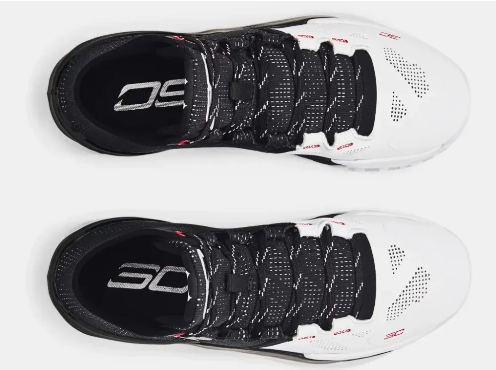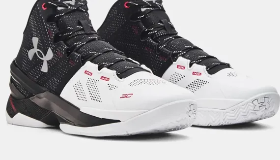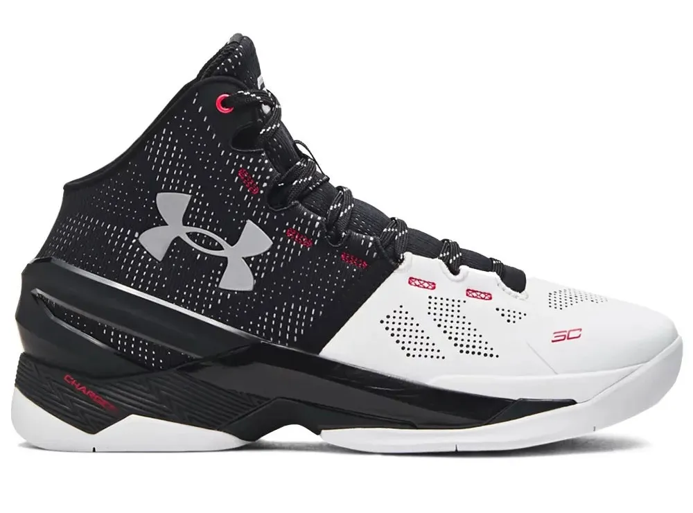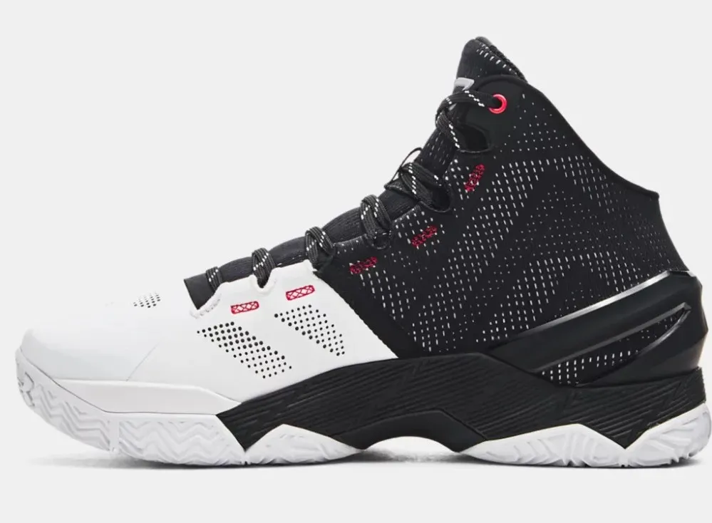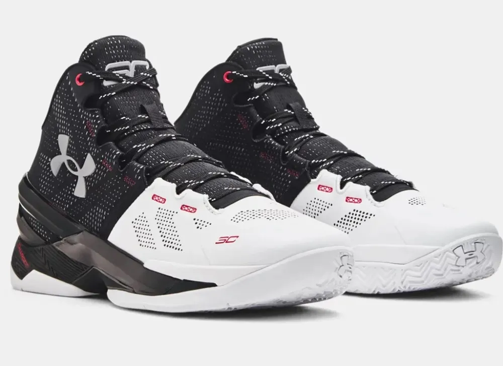 De son côté, Under Armour a ressorti la version « Suit & Tie » de la Curry 2, avec une tige en noir et blanc assortie de finitions en rouge, et le même principe repris pour habiller la languette.