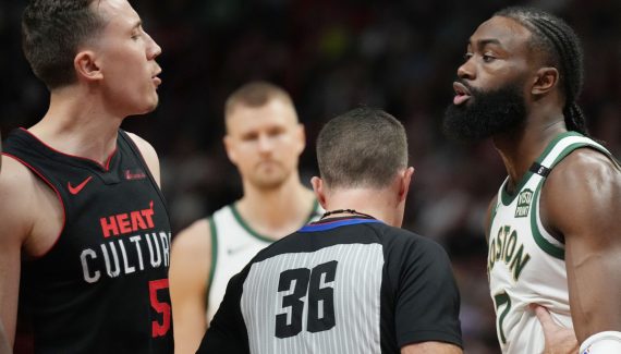 Sanctionné dès que Jaylen Brown a essayé de bouger son bras, Duncan Robinson ne s’est pas dégagé, ce qui a eu le don d’énerver Jaylen Brown. Résultat des courses, le joueur des Celtics a envoyé un coup sec qui a fait voler son homologue du Heat, lui causant au passage une faute flagrante 1 et un début d’échauffourée entre les deux équipes.