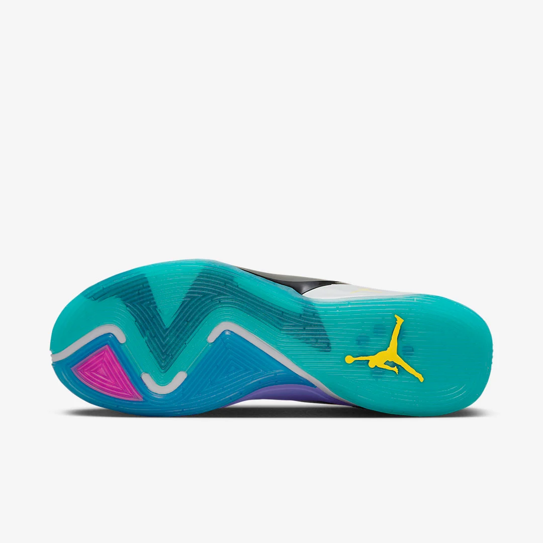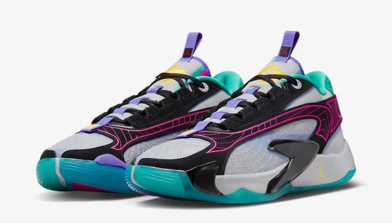 La Jordan Luka 2 « All Star » se présente avec une base en mesh blanc pour la tige, recouverte de bandes noires en nubuck, et assortie de finitions en rose. L’ensemble est complété par du violet et du vert tandis que le logo du joueur sur la languettes et les « Jumpman » ressortent en jaune. Pour finir, la mousse « Formula 23 » blanche en guise de semelle intermédiaire repose sur une surface extérieure en bleu turquoise translucide.