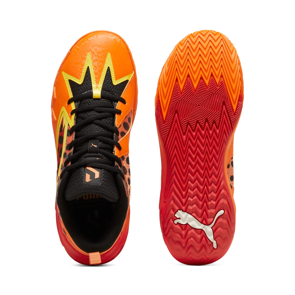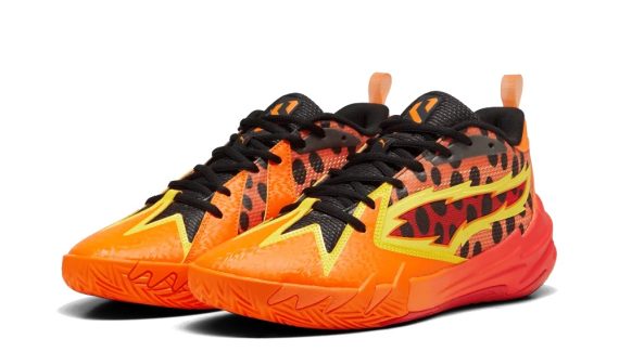 La première chaussure signature de Scoot Henderson arbore donc un coloris inspiré des biscuits apéritifs proposés par la marque, avec une tige orange dotée de finitions en jaune, comme sur les contours de la flamme sur l’empeigne, et en noir. La semelle offre un dégradé de l’orange partant vers le rouge pour accentuer un effet « épicé ».