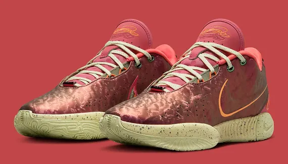 La tige d’un ton rougeâtre appelé « Ember Glow » est assortie d’un effet iridescent censé refléter la brillance d’un coquillage. Les finitions comme les contours du Swoosh, la languette et la signature de LeBron James ressortent en rouge et orange, tandis que la semelle est en jaune tachetée de noir.