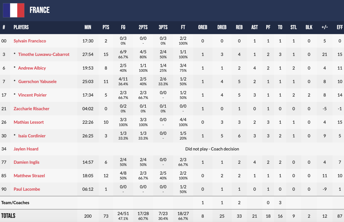 Il y a du mieux dans le deuxième. L’intensité commence à monter défensivement, toujours un bon signe pour Vincent Collet. Timothé Luwawu-Cabarrot et Matthew Strazel sanctionnent à 3-points et les Bleus commencent à prendre de l’air (+11). Derrière, surtout, 10 points rapides du meneur de Monaco, qui célèbre son premier match international de fort belle manière.