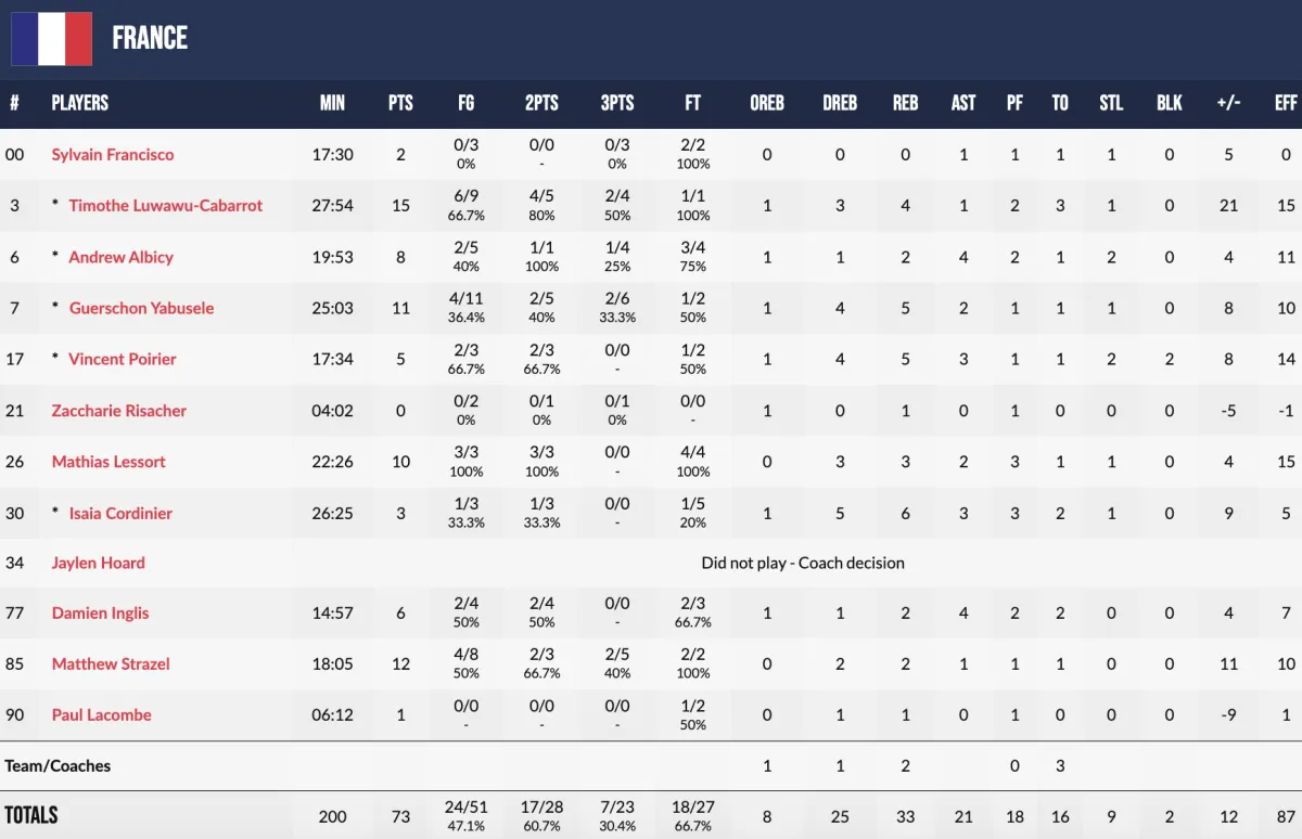 Ce temps-fort reste de courte durée, avec un jeu collectif encore balbutiant et trop de maladresse aux tirs, à l'image de Yabusele à 0/4 à 3-points. Zaccharie Risacher honore sa première cape, sous les yeux de ses parents, et les Bleus sont devant d'une courte tête au terme d'un premier quart-temps pour le moins laborieux (15-14).