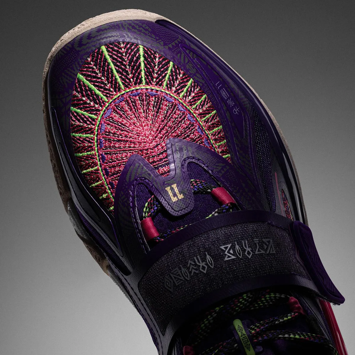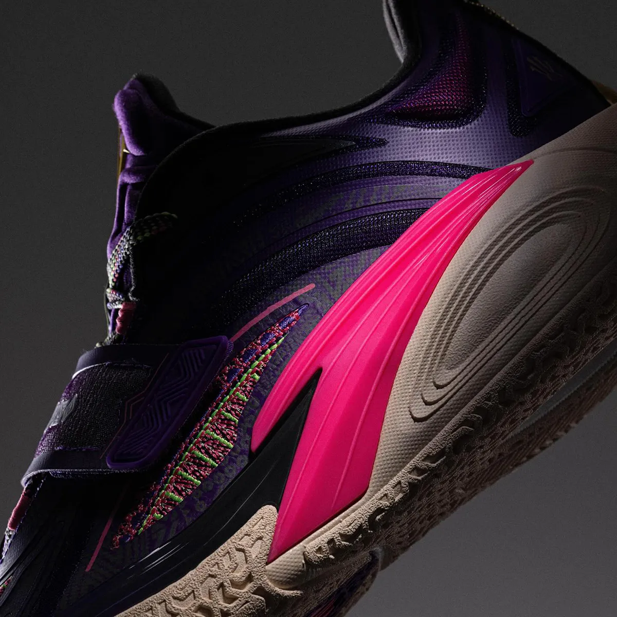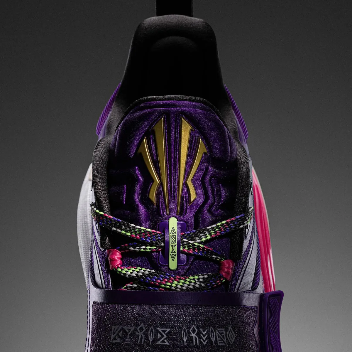 Le premier coloris « Artist on Court » de cette Kai 1 a officiellement été présenté. On peut déjà distinguer la présence d’un strap sur le milieu du pied, et ça rappelle évidemment certaines modèles de la Kyrie chez Nike, ou la bien nommée FlyTrap. Ensuite, la tige en noir et violet complétée par des motifs brodés sur l’avant du pied, peut-être inspirés des origines indiennes du joueur, en rose, rouge, doré, vert et violet. Le nouveau logo est également présent en doré sur la languette et au niveau du talon, tandis que la semelle extérieure ressort en blanc nacré.