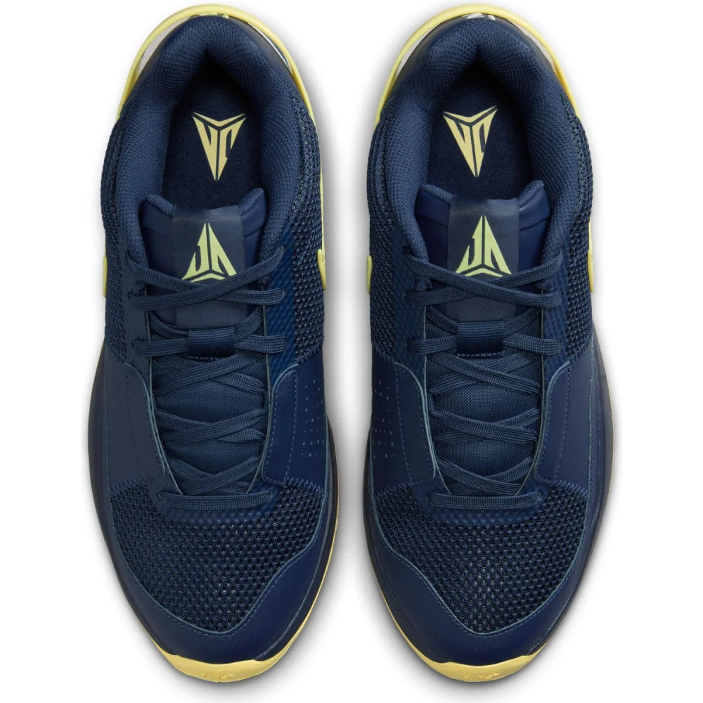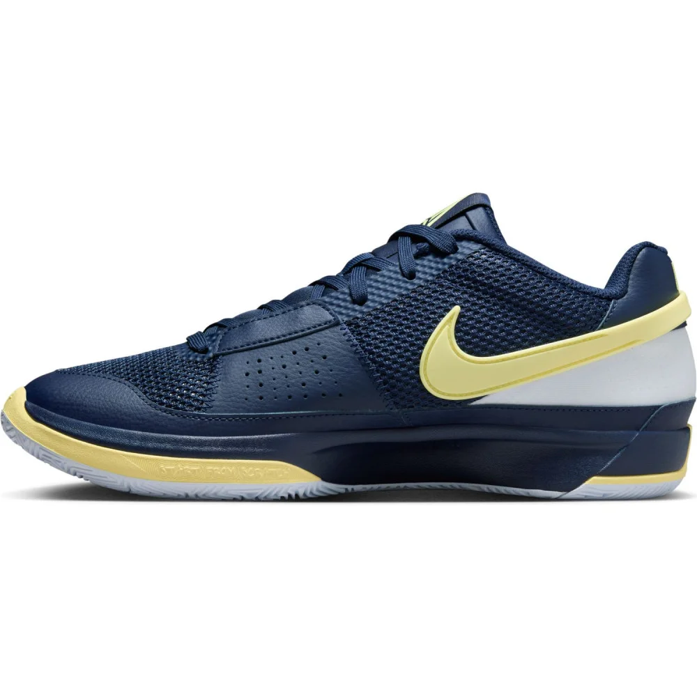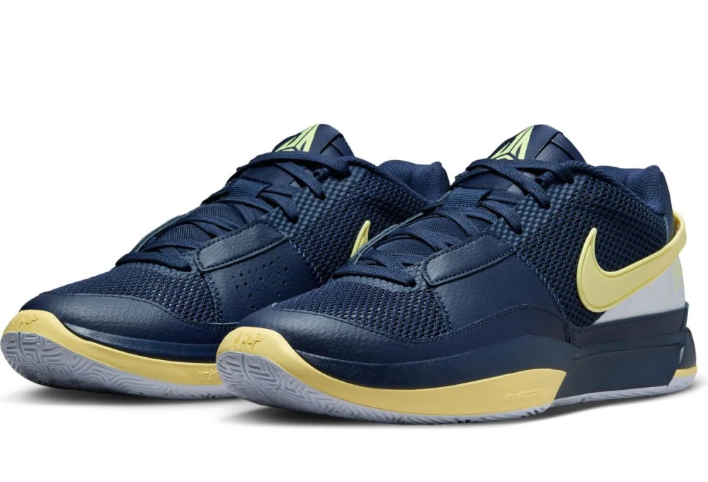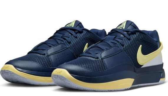 La nouvelle Ja 1 permet à Nike et à Ja Morant de rendre hommage au parcours du meneur avec les Racers avec ce coloris « Murray State ». Reprenant les couleurs historiques de l’équipe universitaire, la tige se présente en bleu marine et blanc, traversée par un « Swoosh » jaune pâle.