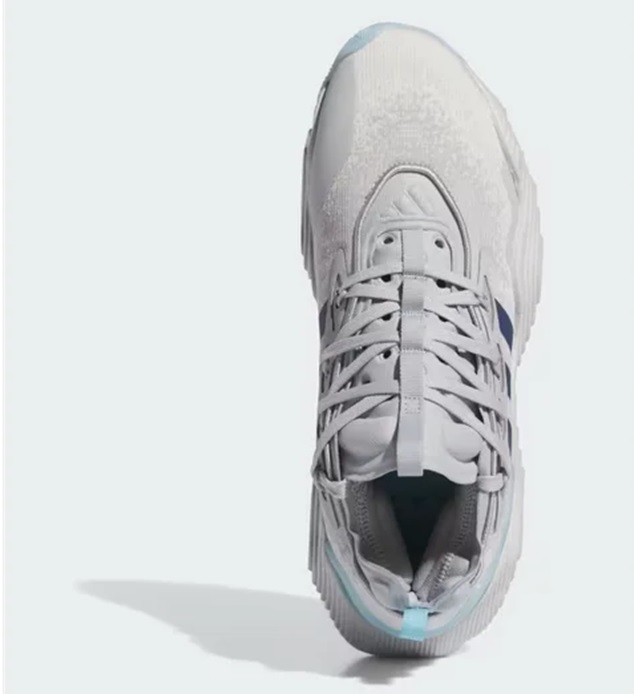 La tige est principalement gris clair, tout comme la semelle inspirée de l’Adilette 22 niveau design. Les trois bandes d’adidas ressortent en bleu marine sur l’empeigne. Les autres finitions apparaissent d’un bleu bien plus clair, sur la tirette, la base en TPU au niveau du talon et la semelle extérieure.