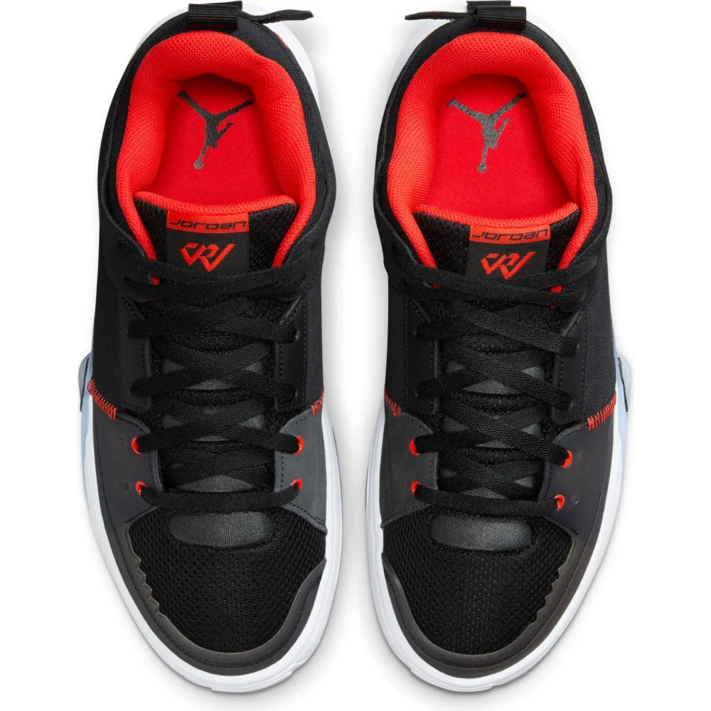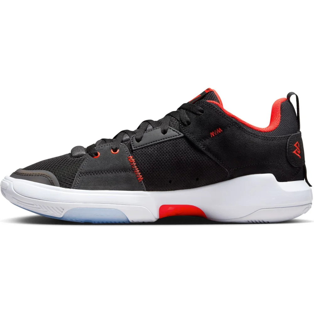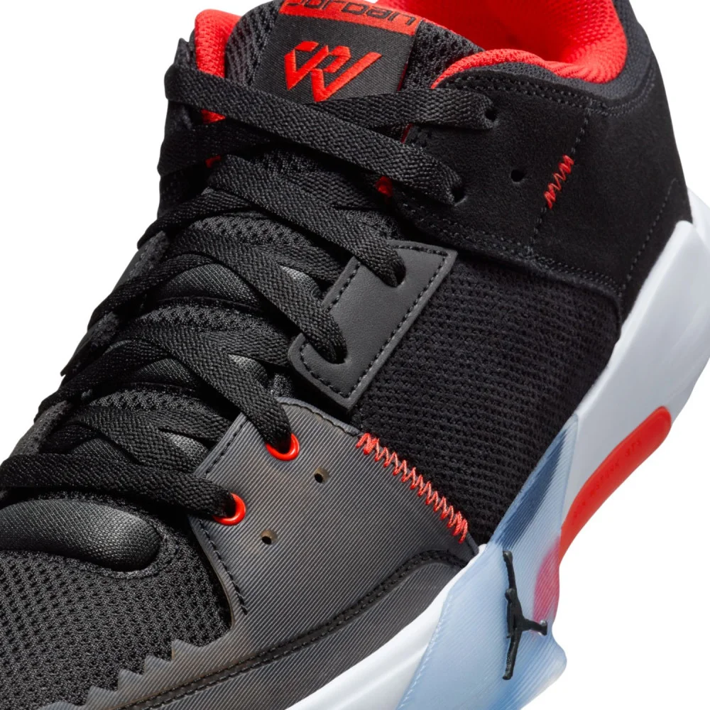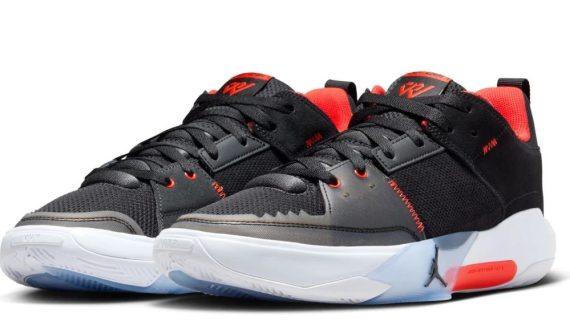 Jordan Brand s’est inspiré de son fameux coloris « Bred » pour cette première avec une tige en noir assortie de finitions en rouge, pour faire ressortir le logo du joueur notamment, sur la languette et le talon. L’ensemble repose sur une semelle blanche assortie de rouge et de noir, ainsi que d’une partie en bleu clair translucide.