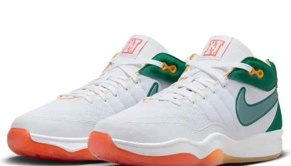 Avec un coloris du même nom, la Nike GT Hustle 2 marie une tige principalement blanche avec des touches de vert, au niveau du talon et du col, ainsi que sur le « Swoosh » présent sur l'empeigne. L'ensemble est complété de parties en jaune orangé, pour faire ressortir le N de Nike sur la languette ou habiller la semelle extérieure.