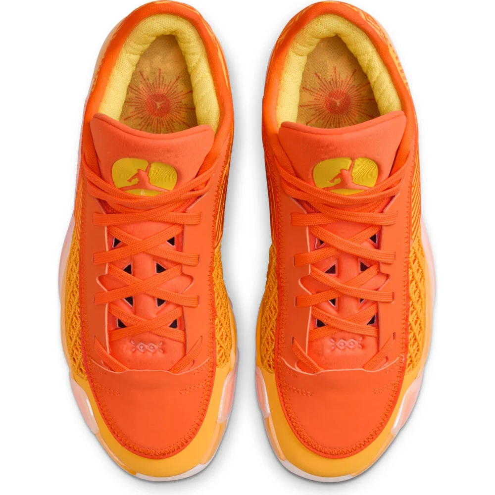 Difficile de ne pas faire le lien avec sa grande soeur baptisée « WNBA » au niveau du choix des couleurs. Cette version Low se distingue par ses deux teintes d’orange pour orner la tige, avec des finitions en jaune, sur la languette pour faire ressortir le « Jumpman » en orange, ou à l’intérieur du col.