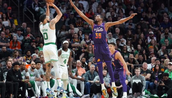 Après la pause, “KD” continue d’enfiler les paniers et comme les joueurs de Boston perdent des ballons, les Suns commencent à se rapprocher. Mais ce n’est pas assez pour espérer les bousculer (78-87). Surtout qu’avec des paniers primés de Tatum et des dunks de Luke Kornet, toujours bien placé, les troupes de Joe Mazzulla restent encore à distance.