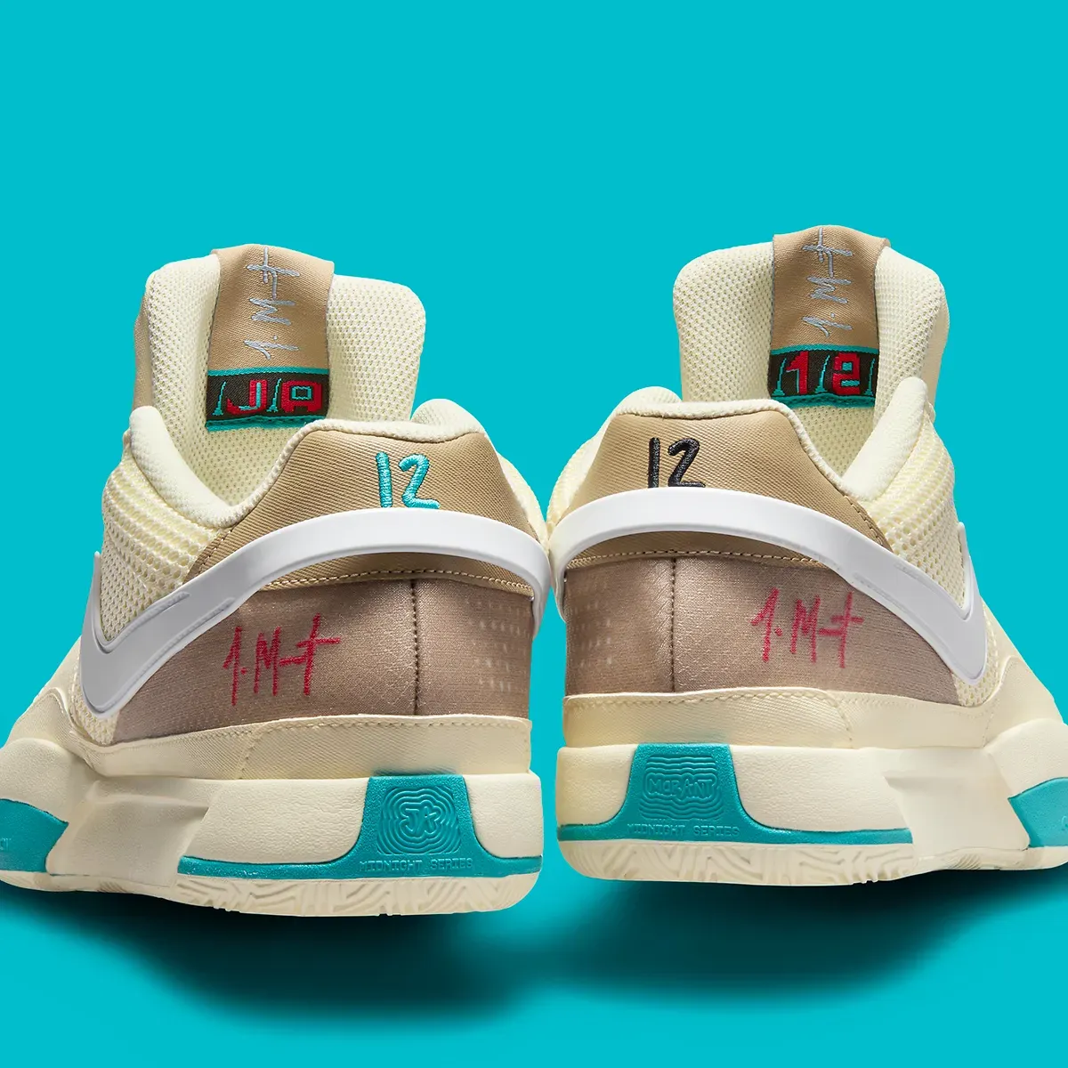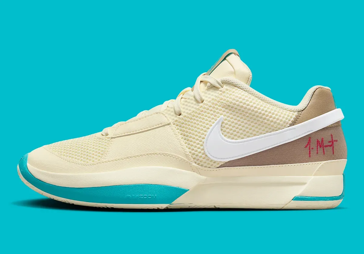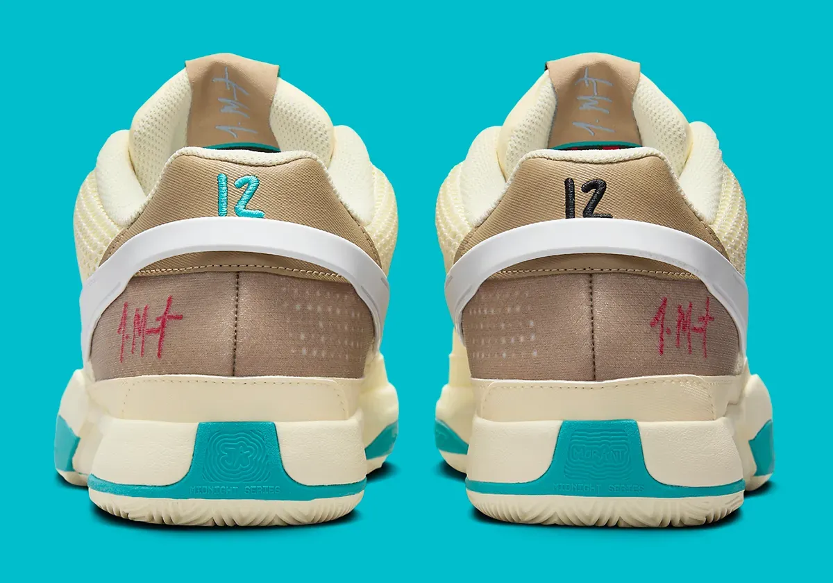 On retrouve donc une tige en blanc nacré avec un “Swoosh” blanc. Le talon apparaît en marron avec également une petite touche de rouge également inspirée des maillots initiaux des Grizzlies. Mais c'est au niveau de la semelle intermédiaire en bleu turquoise que le clin d'oeil “rétro” est le plus marquant, ainsi qu'à l'intérieur de la languette sur les inscriptions “Ja” et “12”.