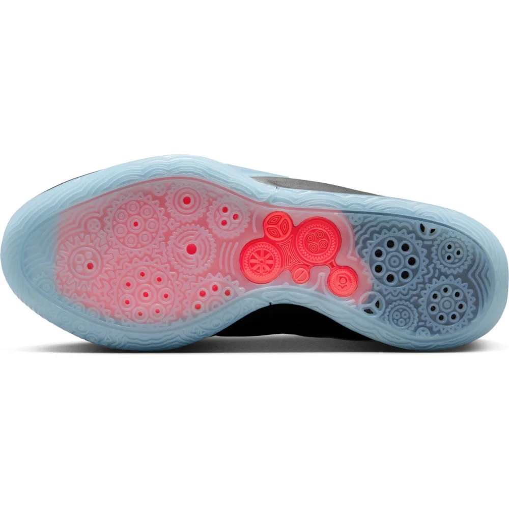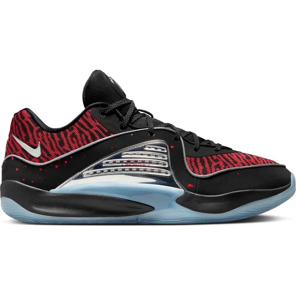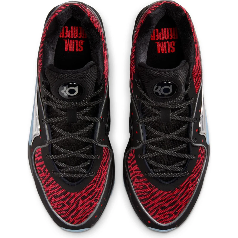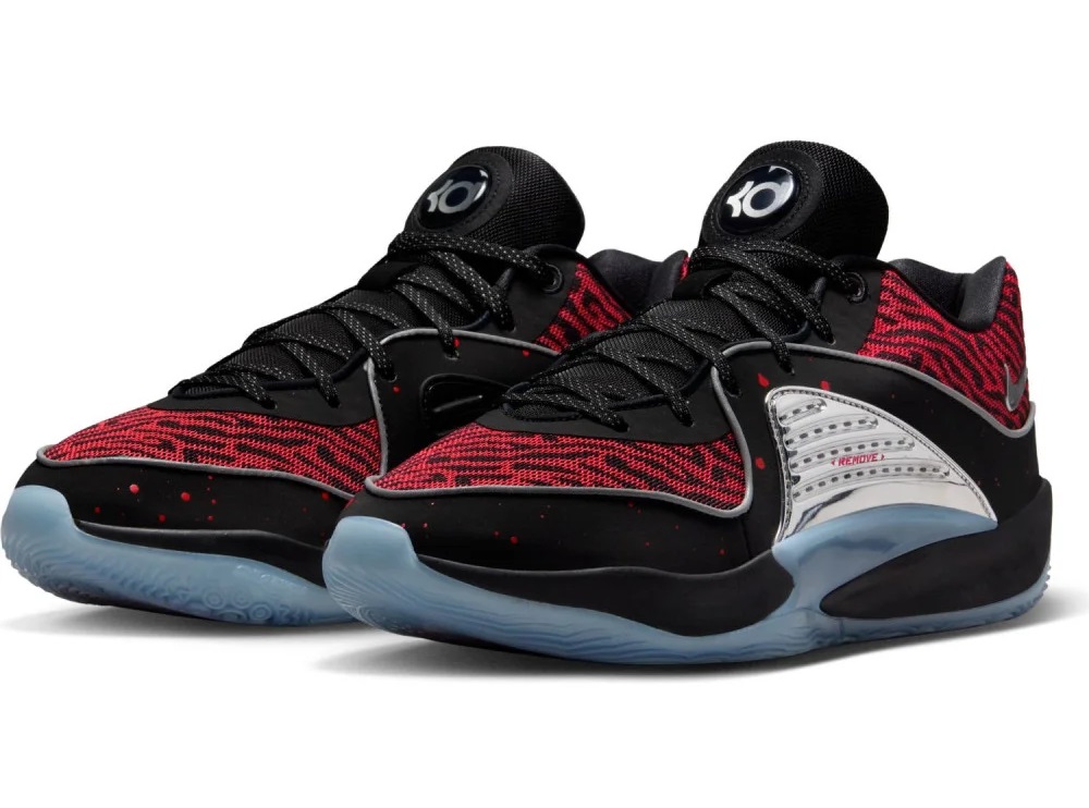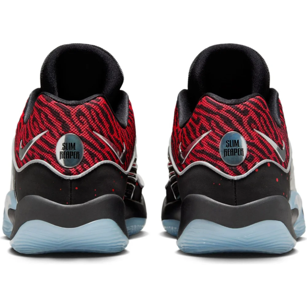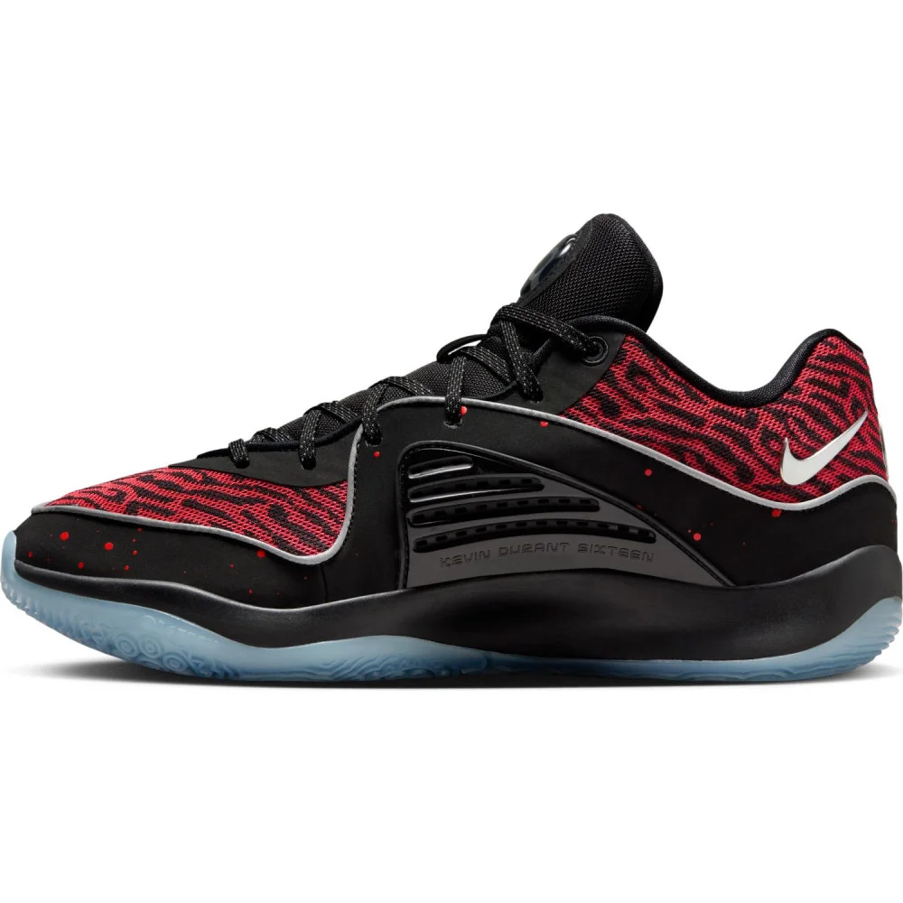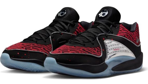 Pour cette nouvelle KD 16, Nike a opté pour un coloris « Slim Reaper », tiré du surnom de Kevin Durant, avec une tige en rouge et noir. Les renforts latéraux en TPU ressortent en noir et blanc tandis que la semelle extérieure apparaît en bleu ciel.